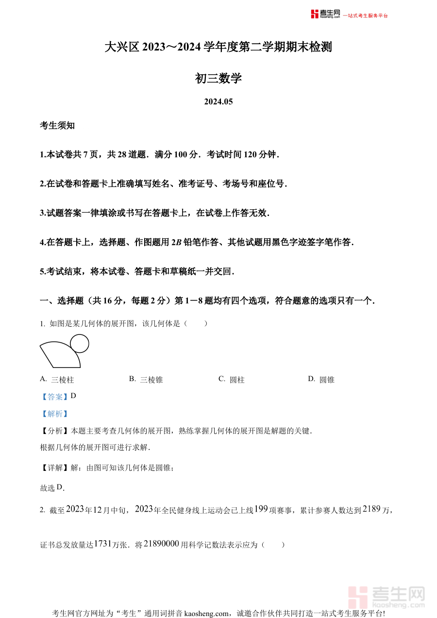 《精品解析:2024年北京市大兴区中考二模数学试题(解析版)》是聚焦2024年北京市大兴区初中毕业生学业水平第二次模拟考试的数学学科专项备考资料,紧密结合该地区中考二模考试的命题特点与本地教学实际,为考生呈现具有针对性的试题解析内容,是考生在该阶段复习过程中了解本地考试趋势、对接考试要求的重要参考载体。