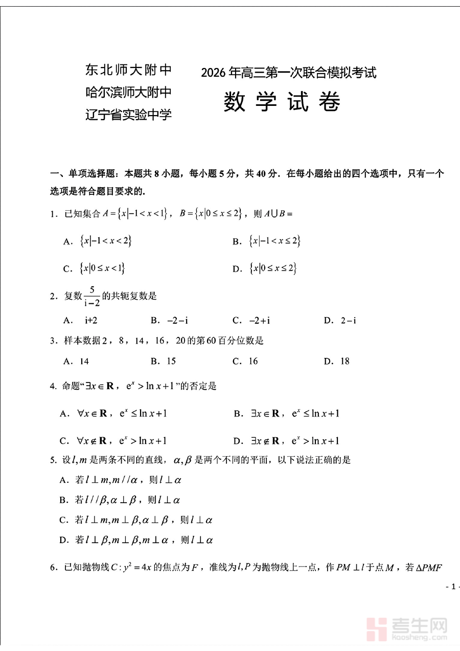 《2026届东北三省三校(哈师大附中、东北师大附中、辽宁实验)高三下学期一模数学试卷+答案》是针对2026届高三学生的区域性模拟考试资料,由东北三省三所知名重点中学联合命制的一模数学试卷及配套答案组成。该资料依托三校优质的教学资源与丰富的命题经验,贴合高三下学期复习阶段的核心需求,为学生提供了与区域教学进度和考试要求高度匹配的备考素材。