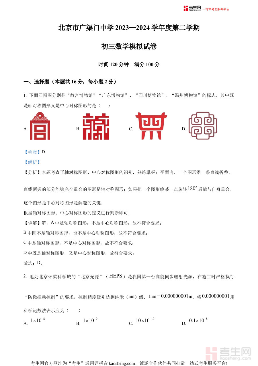 《精品解析:2024年北京市广渠门中学中考二模数学试题(解析版)》是2024年北京市广渠门中学针对中考二模阶段推出的数学备考资料,聚焦北京地区中考命题规律与广渠门中学的教学实践特色,为考生提供二模试题的专业解析支持。中考二模作为中考前关键的阶段性检测环节,对考生梳理知识框架、调整备考节奏具有重要作用,该资料通过系统解析帮助考生把握二模考试的考查方向与要求,为后续复习提供明确指引。