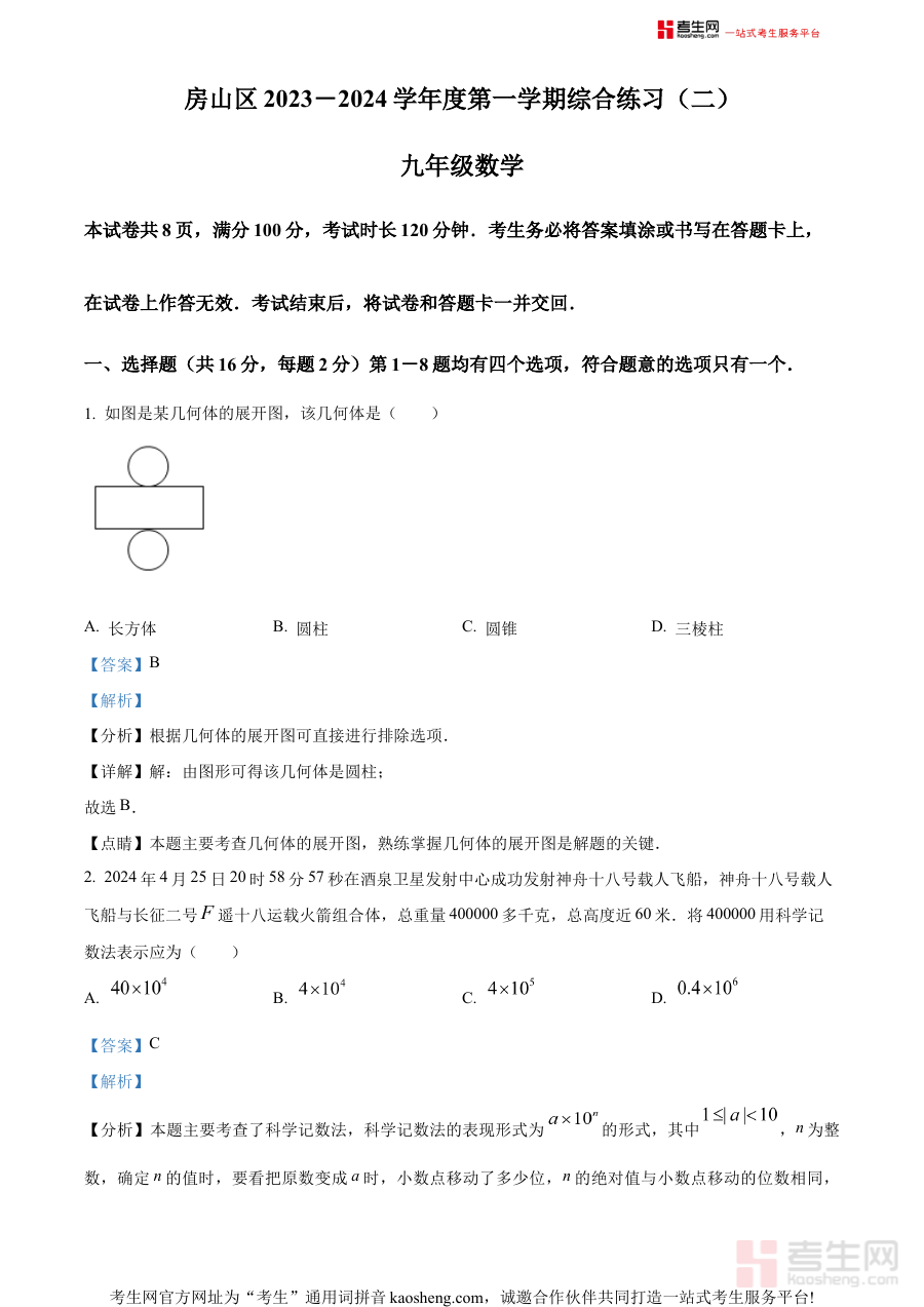 本资料主要适用于2024年北京市房山区的初中应届毕业生、数学学科任课教师以及参与中考备考指导的相关教育工作者。对于学生而言,它能帮助其深入理解解题逻辑与方法,提升应试技巧和综合能力;对于教师来说,可借助其把握区域命题趋势,优化教学安排与复习计划;对于备考指导者而言,它是制定科学备考方案的重要参考,助力考生在中考前做好充分的知识储备与应试准备。