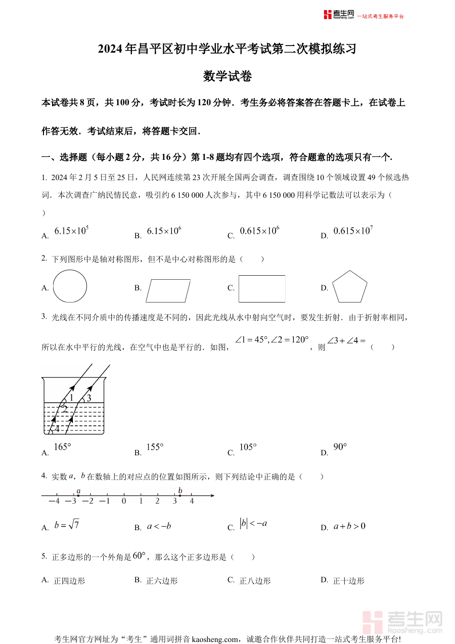 《精品解析:2024年北京市昌平区九年级中考二模数学试题(原卷版)》是面向2024年北京市昌平区九年级学生推出的中考数学第二次模拟考试备考资料。该资料紧密结合昌平区本地中考数学命题方向与教学实际情况,以原卷形式呈现二模考试试题内容,旨在帮助学生提前适应区域模拟考试的形式、题型分布及难度设置,为后续的中考冲刺复习奠定基础,同时也为教师提供贴合本地教学需求的参考资源。
