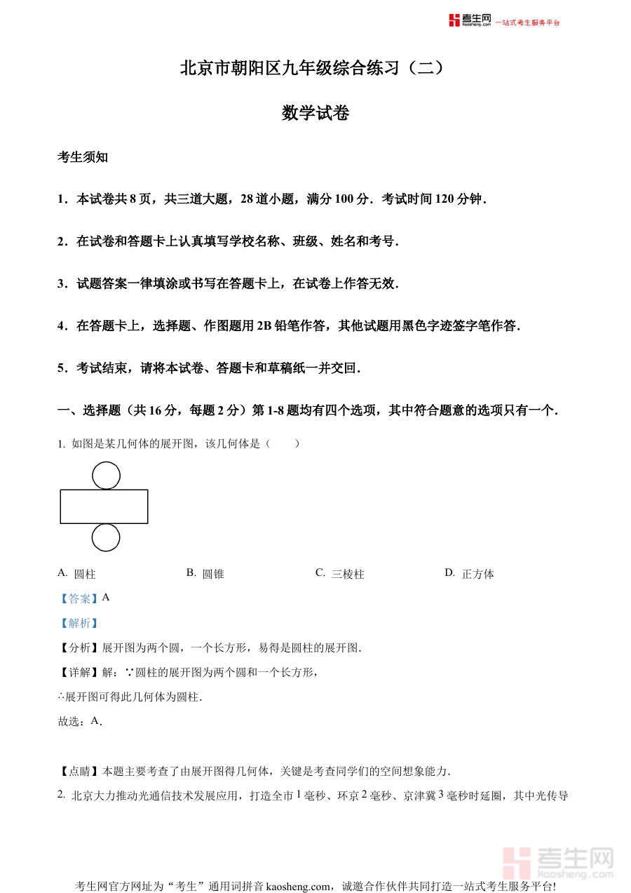 《精品解析:2024年北京市朝阳区中考二模数学试题(解析版)》是针对2024年北京市朝阳区初中毕业生中考第二次模拟考试数学科目的配套解析资料。该资料紧扣朝阳区中考二模的命题背景与区域教学实际,聚焦中考数学备考的关键阶段需求,为考生和教师提供了具有区域针对性的试题解析支持,是中考备考过程中衔接一轮复习与最终冲刺阶段的重要辅助材料。