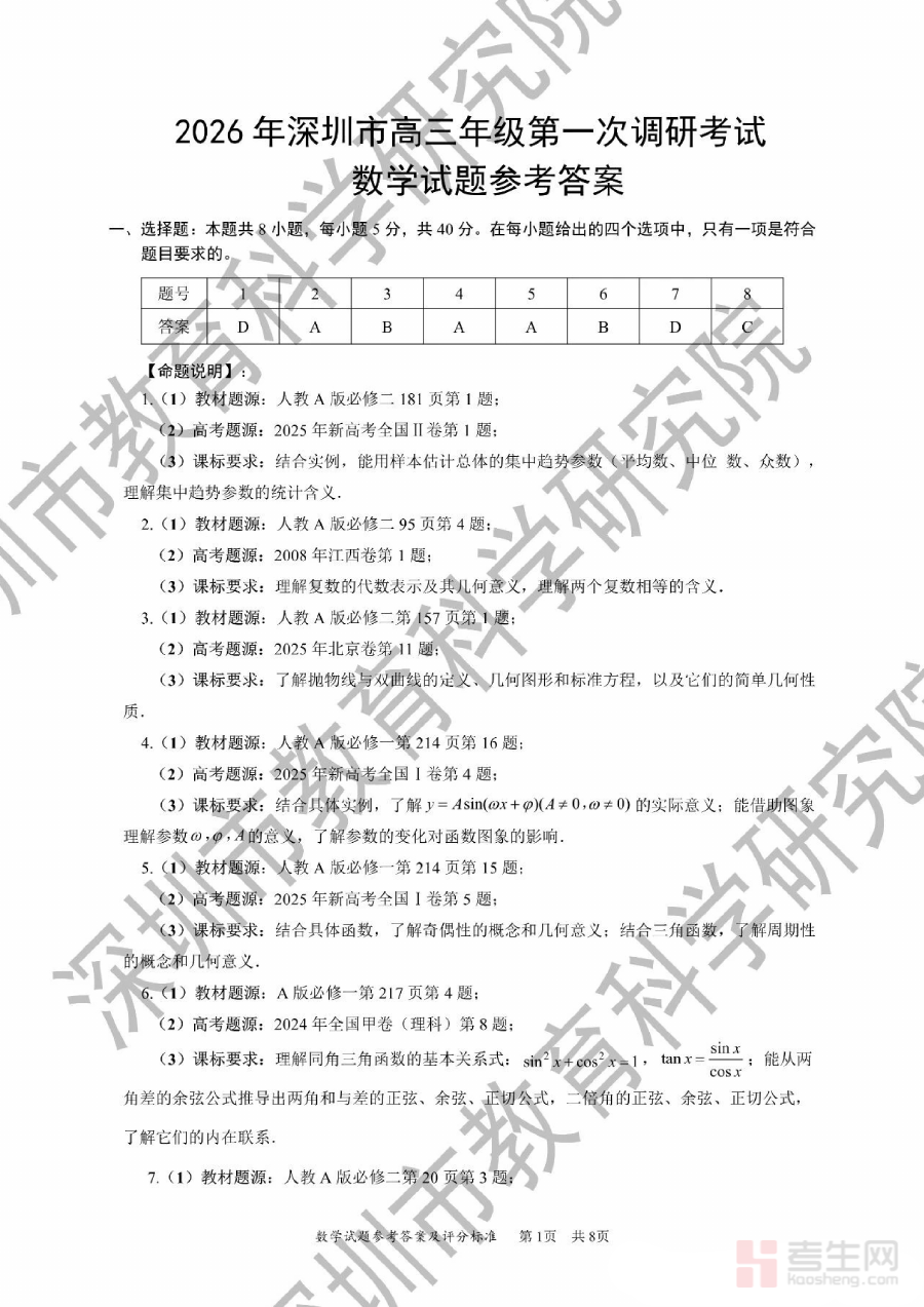 此资料适用于2026届深圳市高三学生、数学教师及相关教育工作者;对学生而言,有助于调研考试后的针对性复盘以提升备考效率;对教师及教育工作者而言,可助力教学效果评估及备考指导,推动学生在高考前关键阶段实现数学能力的稳步提升。