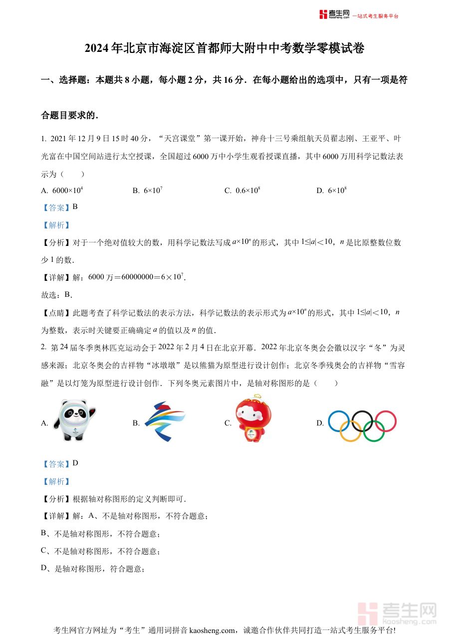 《精品解析:2024年北京市海淀区首都师范大学附属中学中考零模数学试题(解析版)》是2024年北京市海淀区中考备考体系中的重要阶段性资料,由首都师范大学附属中学结合区域中考命题趋势与本校教学经验编制而成,聚焦中考零模这一备考初期的关键节点,为考生提供数学学科的针对性复习支持。该资料包含完整的零模试题及详细解析,旨在帮助考生提前熟悉中考数学的考查框架、题型分布与难度设置方向,为后续系统复习与专项提升明确核心目标,是考生进入中考正式备考阶段的重要参考依据之一。