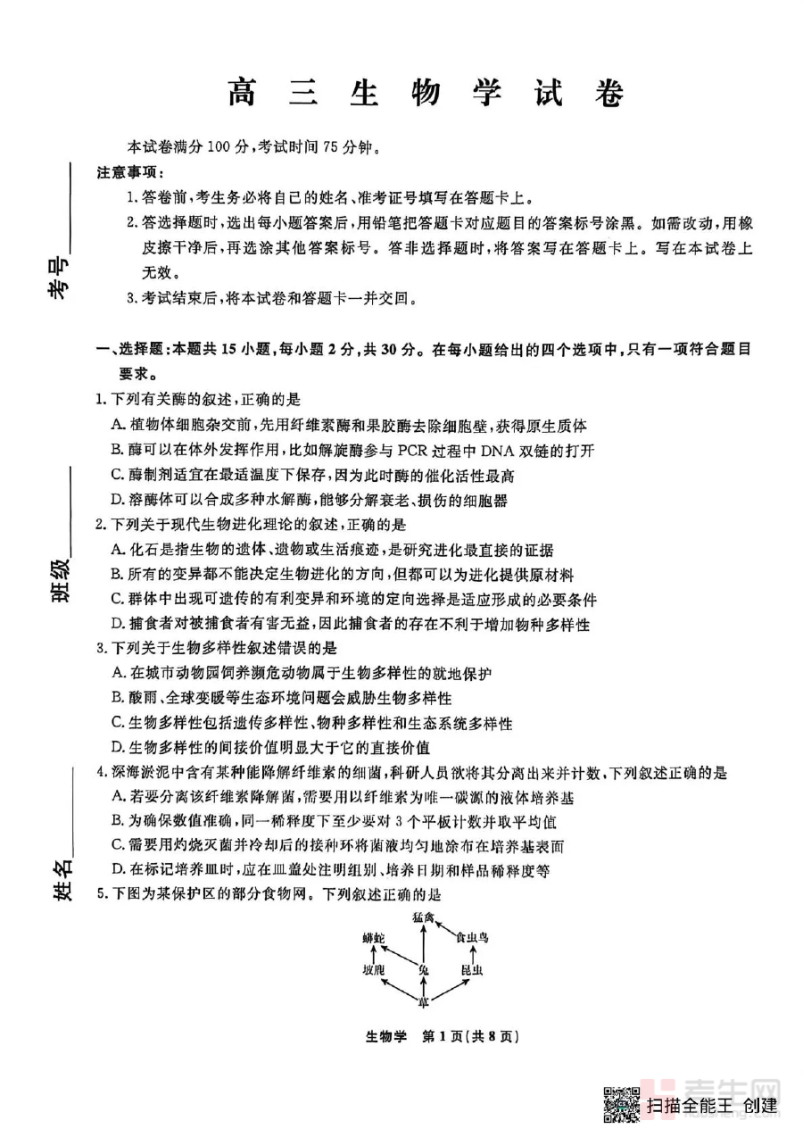 作为高三下学期重要的阶段检测工具,该资料可有效助力学生进行学情诊断,通过完成试卷直观呈现自身在生物学科知识掌握上的薄弱环节;同时也为教师提供了评估阶段教学效果的依据,帮助教师精准调整后续复习计划与教学重点;此外,考生可借助参考答案开展自我批改与深度分析,明确答题规范与得分要点,进一步优化备考策略。
