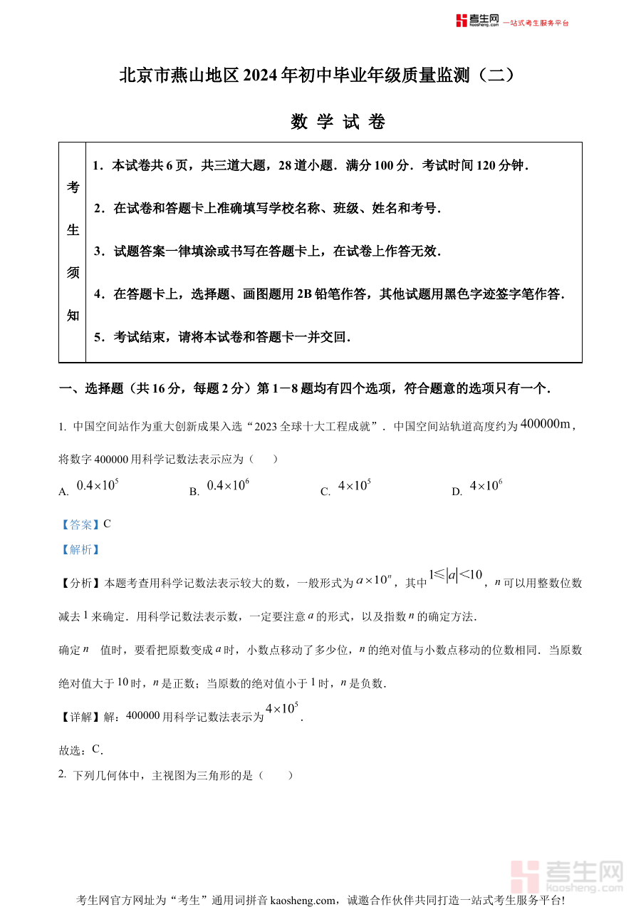 《精品解析:2024年北京市燕山地区中考二模数学试题(解析版)》是针对2024年北京市燕山地区初中毕业生设计的中考第二次模拟考试数学科目的配套解析资料,聚焦该地区中考前的阶段性复习关键节点,为考生提供贴合本地命题趋势和考试要求的专业参考内容,助力考生熟悉二模考试的考查形式与难度水平。