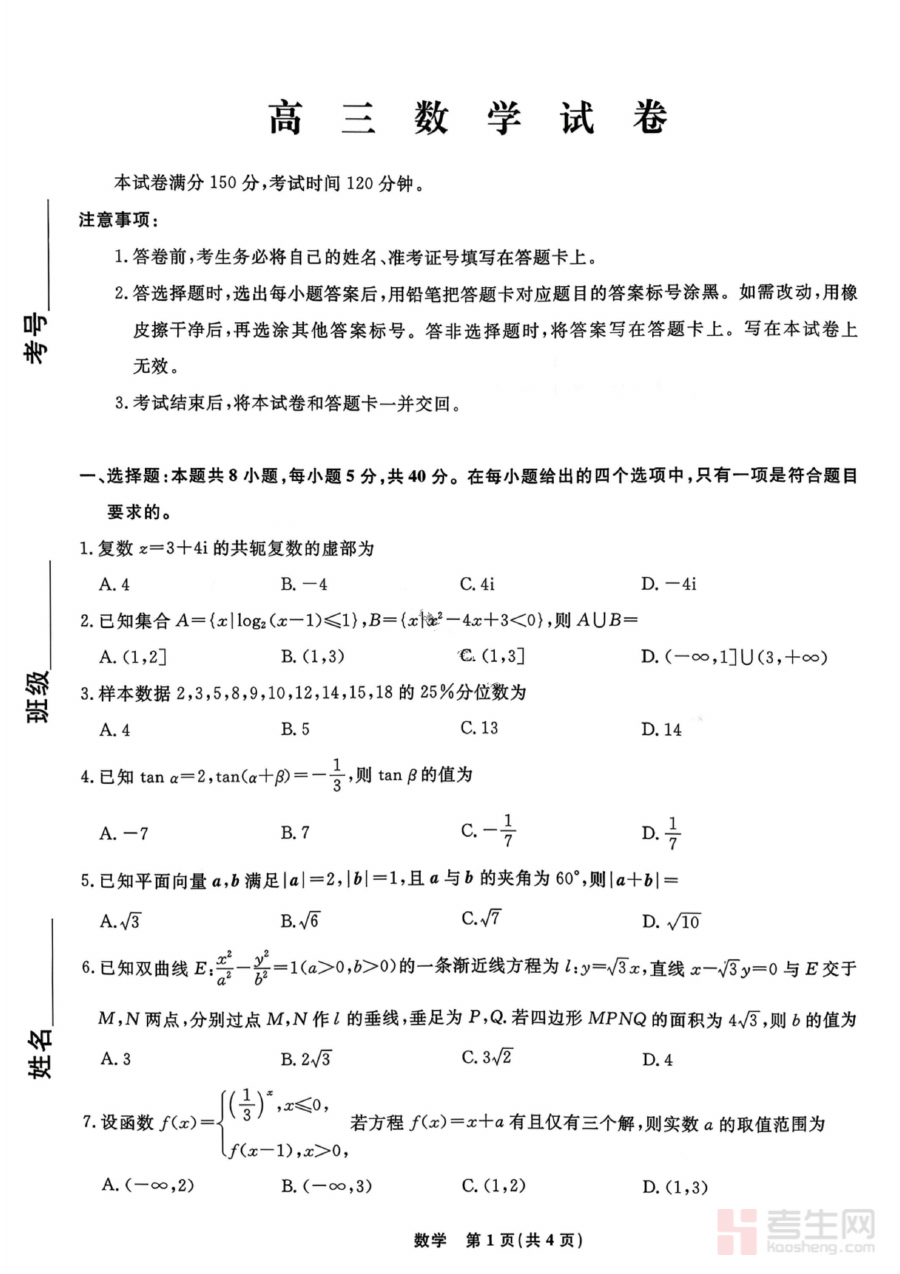 这份资料主要用于高三学生的阶段性学情诊断与备考效果评估,学生通过参与联考可及时发现数学学习中的薄弱模块,为后续针对性复习调整提供明确依据;教师也可借助测试结果掌握学生群体的整体学习状况,优化教学计划与备考指导策略,助力师生共同锚定下一阶段的备考重点。