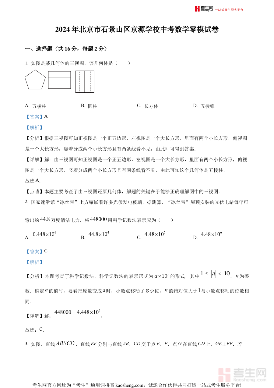 《精品解析:2024年北京市石景山区京源学校中考零模数学试题(解析版)》是面向2024年北京市石景山区京源学校初三学生打造的中考前零模阶段数学学科备考资料。零模考试作为中考复习初期的关键阶段性检测环节,能够帮助学生初步梳理初中数学知识体系的掌握程度,而该资料以解析版形式呈现试题内容,为学生和教师提供了全面且详细的试题解读与分析支持。