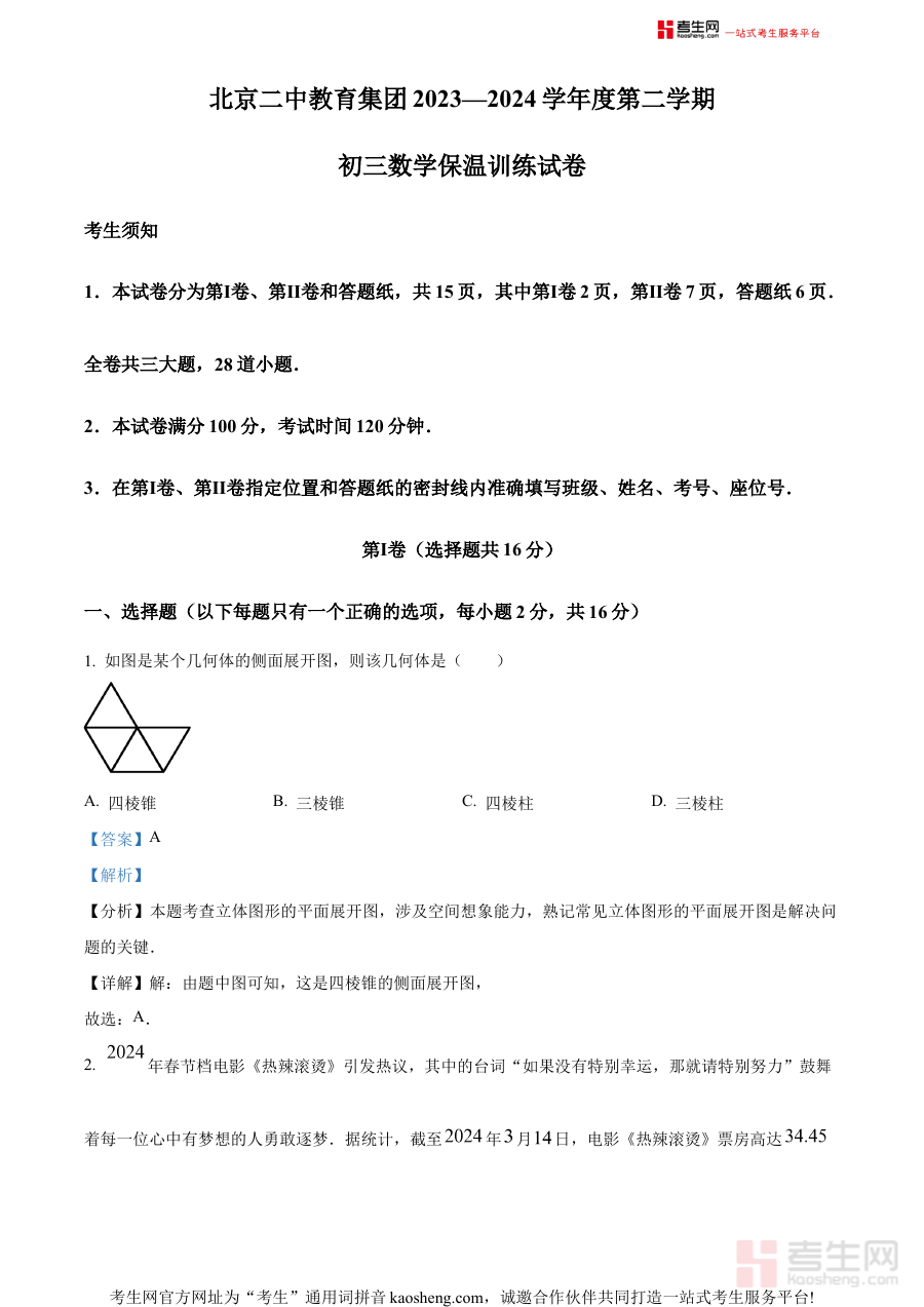 此资料主要适用于北京市第二中学教育集团内及关注该集团教学资源的2024届中考考生,尤其适合需要通过三模测试来检验备考成果、强化应试能力的学生。它不仅能帮助考生熟悉中考数学的题型结构与命题规律,还能通过详细解析引导考生掌握解题思路与技巧,为最终的中考发挥奠定坚实基础,是中考冲刺阶段不可或缺的备考工具。