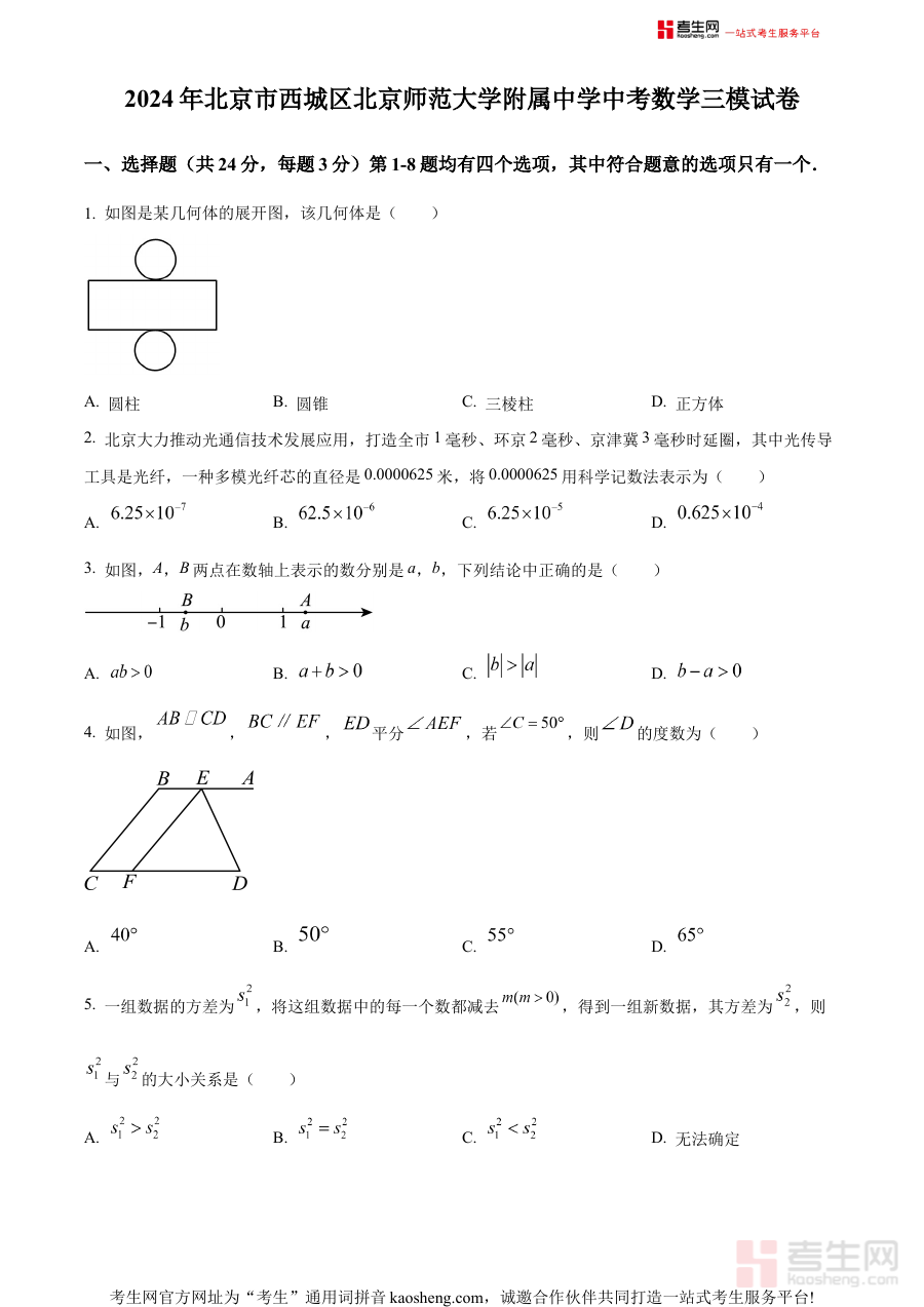 《精品解析:2024年北京市西城区北京师范大学附属中学中考三模数学试题(原卷版)》是2024年北京市西城区北京师范大学附属中学针对中考数学科目推出的第三次模拟考试原卷资料,聚焦中考数学备考的关键阶段,为考生提供贴近本地教学实际与中考命题趋势的模拟测试载体。