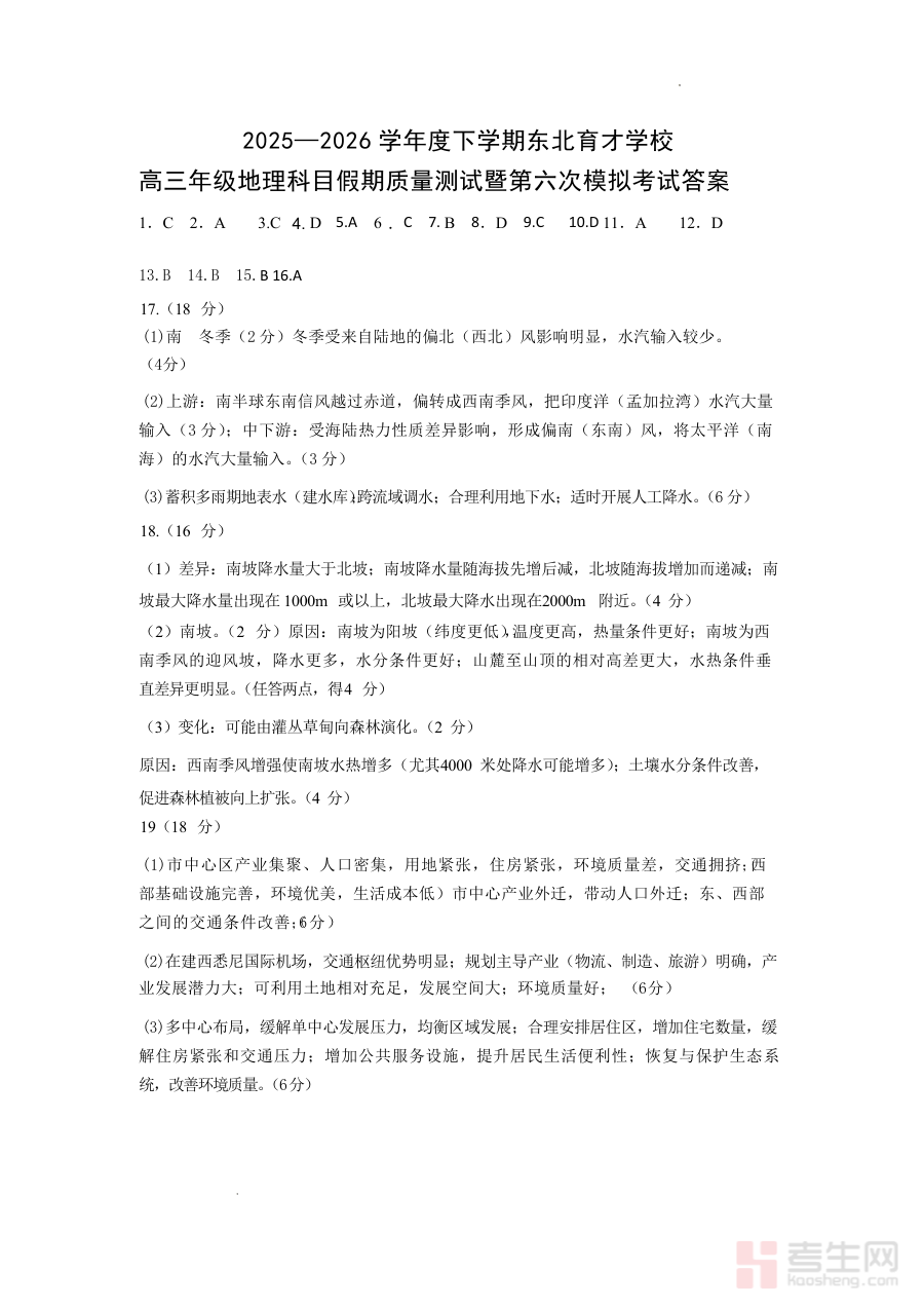 《东北育才学校2025-2026学年高三下学期第六次模拟考试 地理答案》是东北育才学校在2025-2026学年高三下学期组织的第六次模拟考试对应的地理学科答案资料。作为高三阶段关键的模拟考试配套材料,它与该次模拟考试的试题内容直接对应,是考生完成考试后核对答题结果、了解自身地理知识掌握情况的核心参考依据,能够帮助考生直观获取答题的正确方向和标准表述。