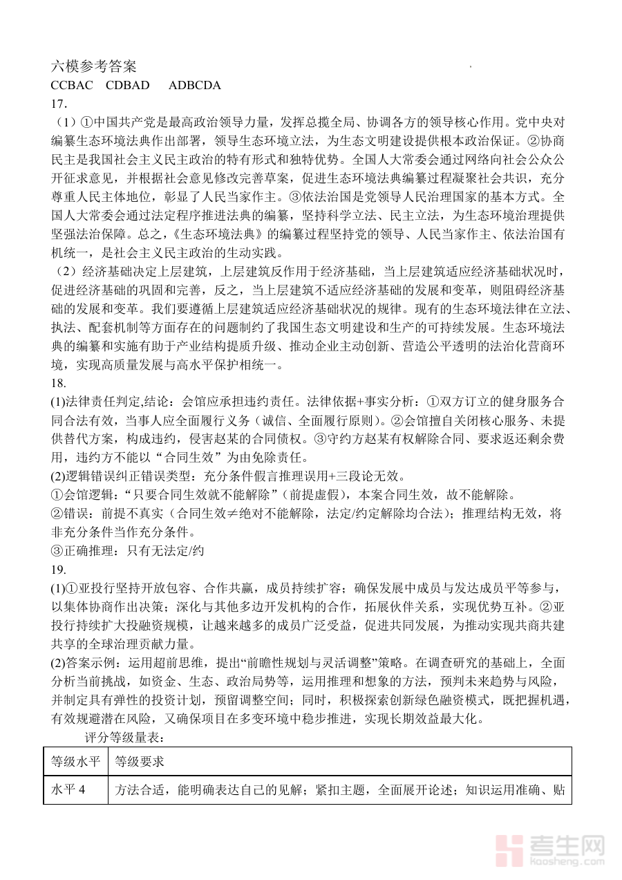 《东北育才学校2025-2026学年高三下学期第六次模拟考试 政治答案》是东北育才学校针对2025-2026学年高三下学期阶段设计的第六次模拟考试的政治学科答案资料,属于高三年级重要的阶段性模拟考试配套资源,能够为考生和教学者提供该次模拟考试的标准化参考答案支持,帮助明确考试答题的规范与方向。