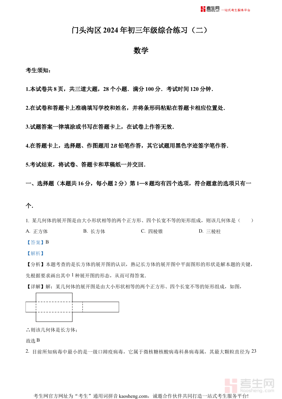 《精品解析:2024年北京市门头沟区九年级中考二模数学试题(解析版)》是2024年北京市门头沟区针对九年级学生推出的中考二模数学试题解析类资料,属于中考备考阶段的重要参考材料。该资料紧密贴合本地中考二模考试的命题方向与区域考情特征,能够为学生提供与实际考试场景高度匹配的备考资源,帮助学生提前熟悉本地二模考试的整体框架与考查重点。