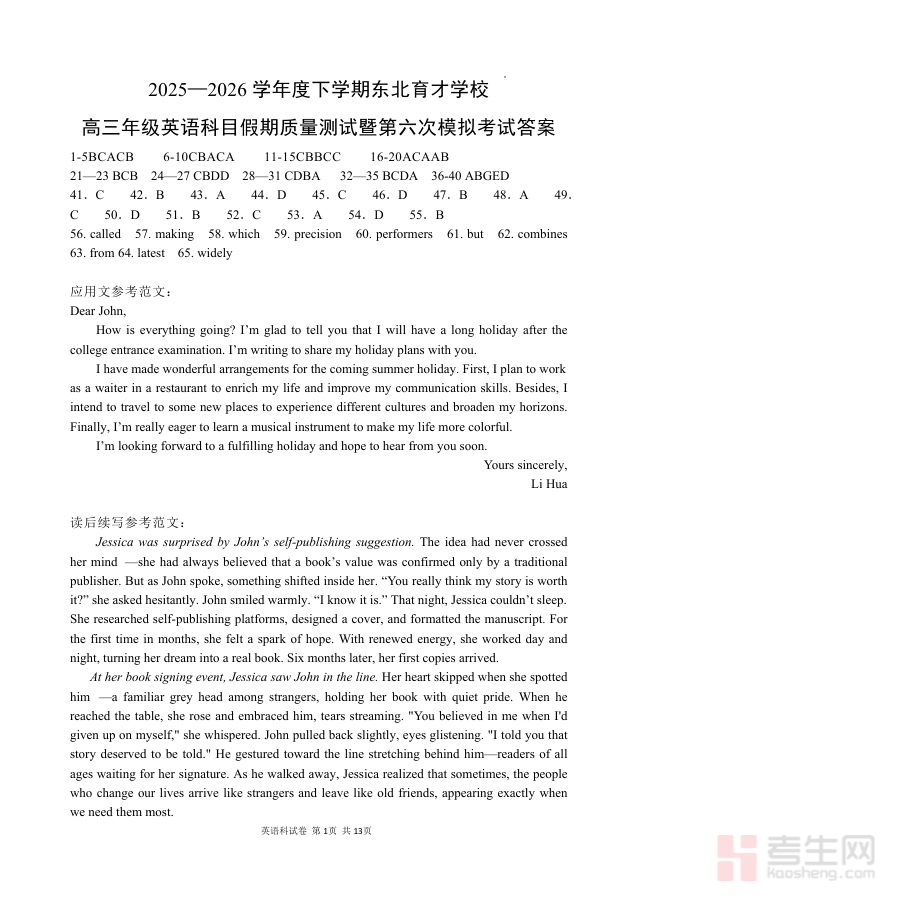《东北育才学校2025-2026学年高三下学期第六次模拟考试 英语答案》是东北育才学校针对2025-2026学年高三下学期学生开展的第六次模拟考试对应的英语科目答案资料,属于高中英语学科阶段性备考支持材料,与该学年特定学期及考试次数的模拟测试直接关联。