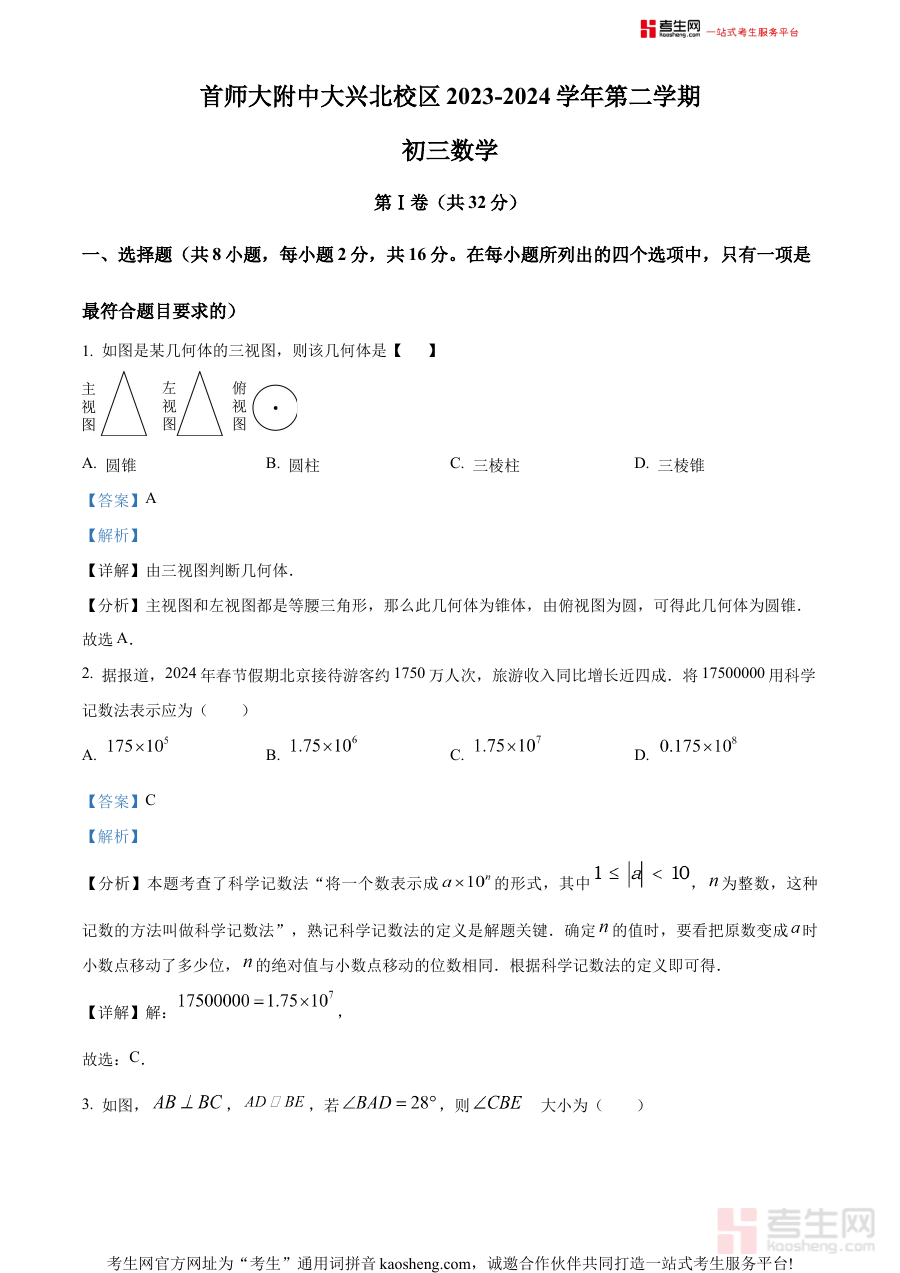 《精品解析:2024年北京市首都师范大学附属中学大兴北校区中考模拟数学试题(解析版)》是2024年北京市面向中考数学的备考资料,由首都师范大学附属中学大兴北校区编制,属于中考模拟类数学试题的解析版本。该资料贴合北京地区中考数学的考查趋势与要求,为考生提供了符合本地命题特点的模拟练习内容及配套详细解析,有助于考生提前熟悉中考数学的题型结构与考查方向。