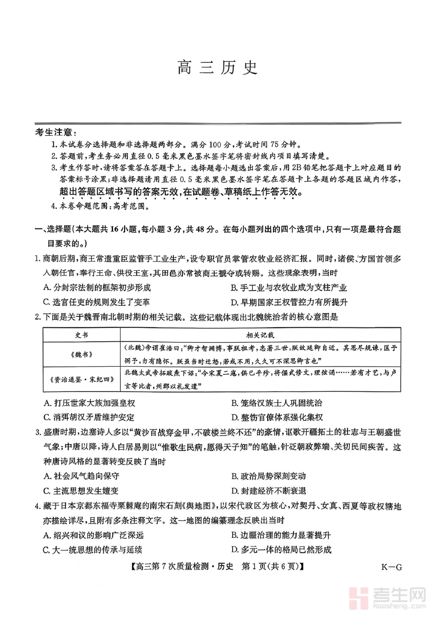 《历史试题2026山西九师联盟高三第7次质量检测3.5-6》是2026年度山西省九师联盟面向其成员学校高三年级组织的第7次质量检测对应的历史学科试题资料。作为区域教研协作体推出的阶段性检测资源,它紧密结合山西省高三历史教学的进度安排与核心素养培养要求,旨在为相关教学单位提供契合当前复习阶段的标准化检测内容,助力师生把握阶段学习动态。