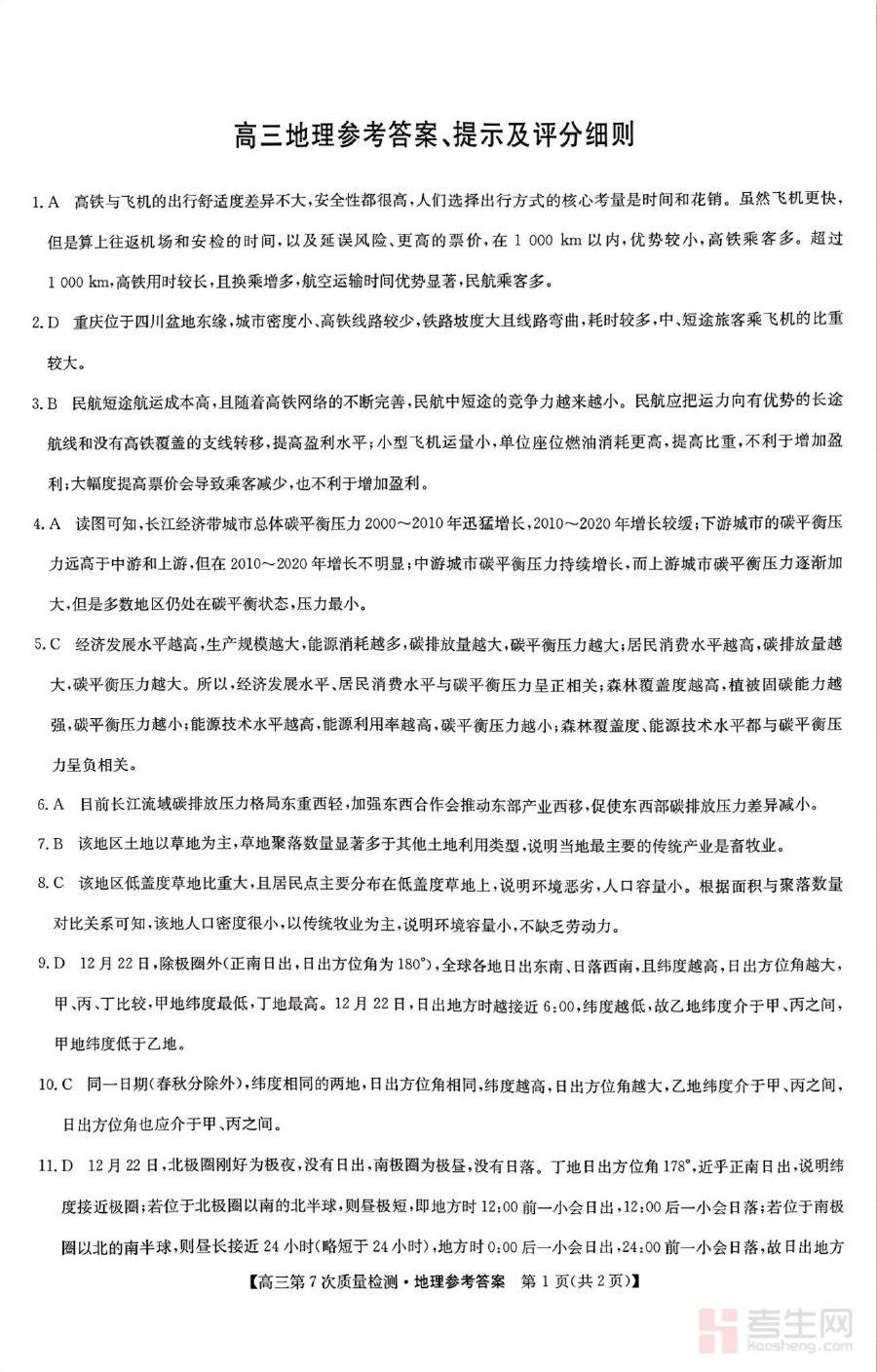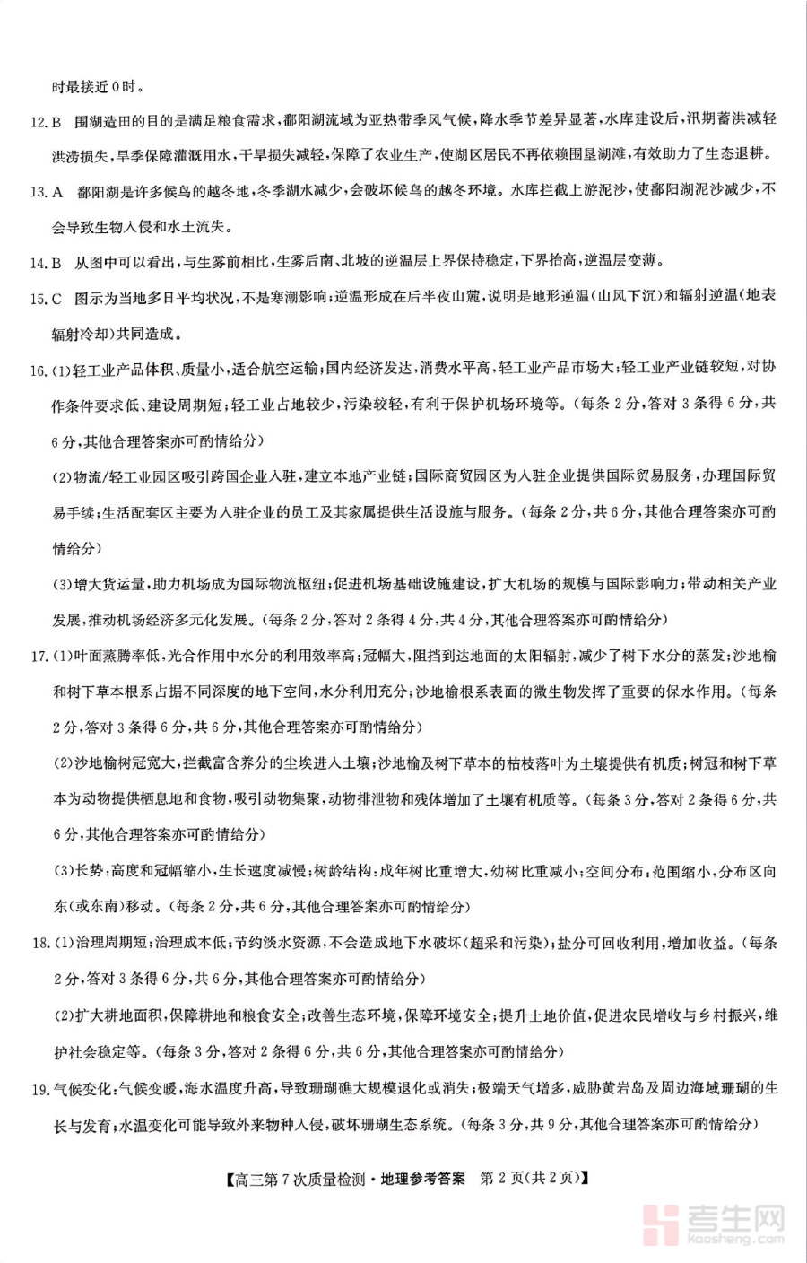 该资料可用于高三学生完成检测后的自我评估环节,帮助学生准确识别自身在地理知识掌握方面存在的薄弱点与不足,从而为针对性复习计划的制定提供清晰参考;同时也为地理教师提供了标准化的评分依据,便于教师高效完成阅卷工作,并及时掌握班级整体的学习情况,进而调整教学策略与复习重点。此外,作为阶段性检测的配套资源,它能辅助师生共同梳理检测中暴露的问题,为下一阶段的备考规划提供数据支撑。
