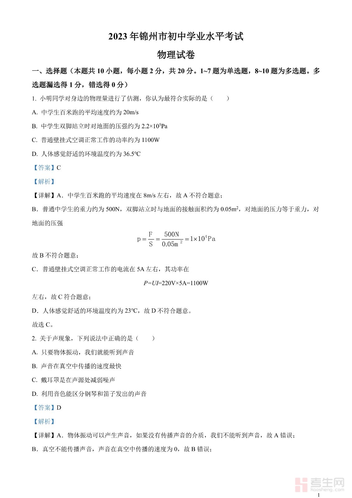 2023年辽宁省锦州市中考物理试题(解析版)