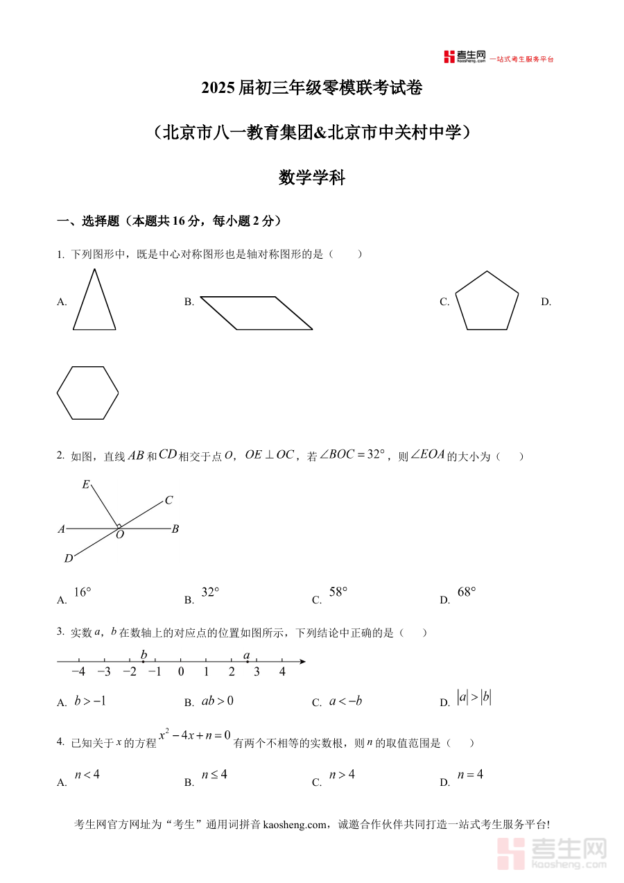 《精品解析:2025年北京八一学校、中关村中学九年级零模联考数学(原卷版)》是针对2025年北京地区八一学校与中关村中学联合开展的九年级零模联考数学科目的原卷形式备考资料。该资料依托两校联合命题的零模联考资源,精准对应九年级学生在中考备考初期阶段的检测需求,为使用者提供贴合校际联考实际的原始试卷内容,是衔接日常学习与中考系统备考的重要阶段性资料。