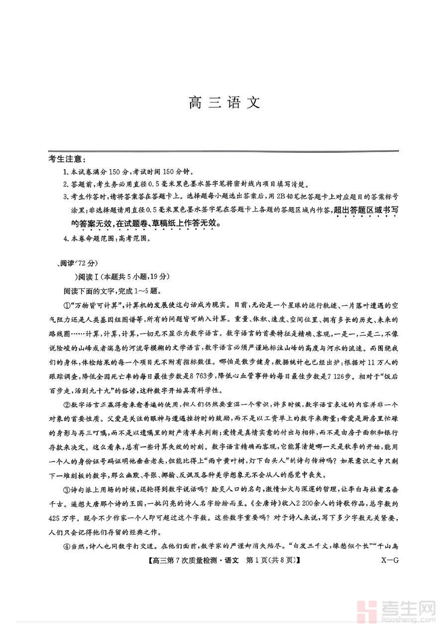 该资料可用于高三学生进行阶段性学习效果的诊断,帮助教师与学生及时掌握当前语文学习的优势与薄弱环节,调整后续备考策略;同时也能作为学生自主复习时的针对性练习材料,辅助其熟悉考试形式、把握答题节奏,为后续的复习规划提供实践依据。