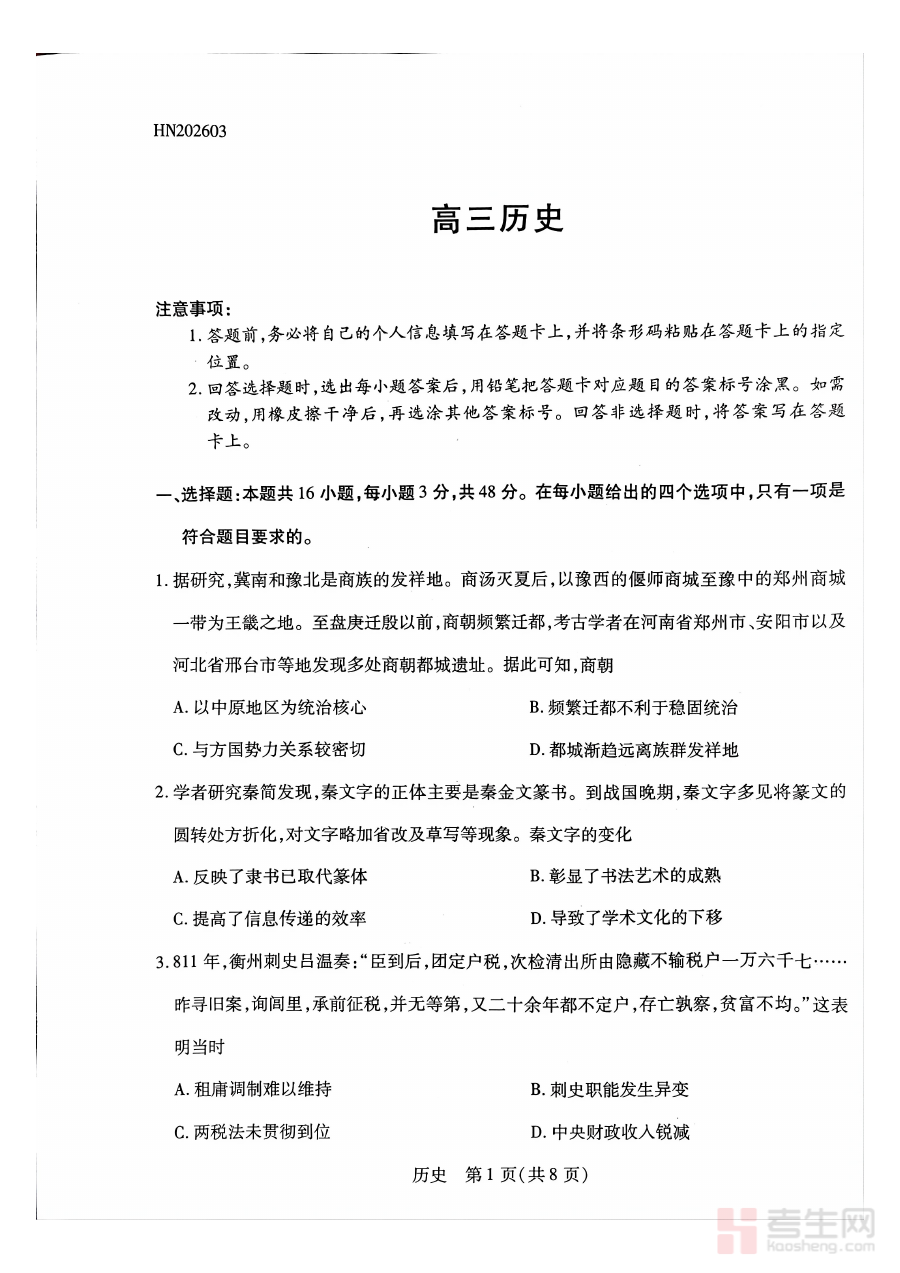 该试题适用于河南省高三年级学生及历史学科教师群体,学生可通过测试明确自身历史学科的优势与不足,为全年备考制定针对性策略;教师可借助测试结果精准把握班级学情,优化教学计划与辅导方案,提升高三历史备考的效率与质量。