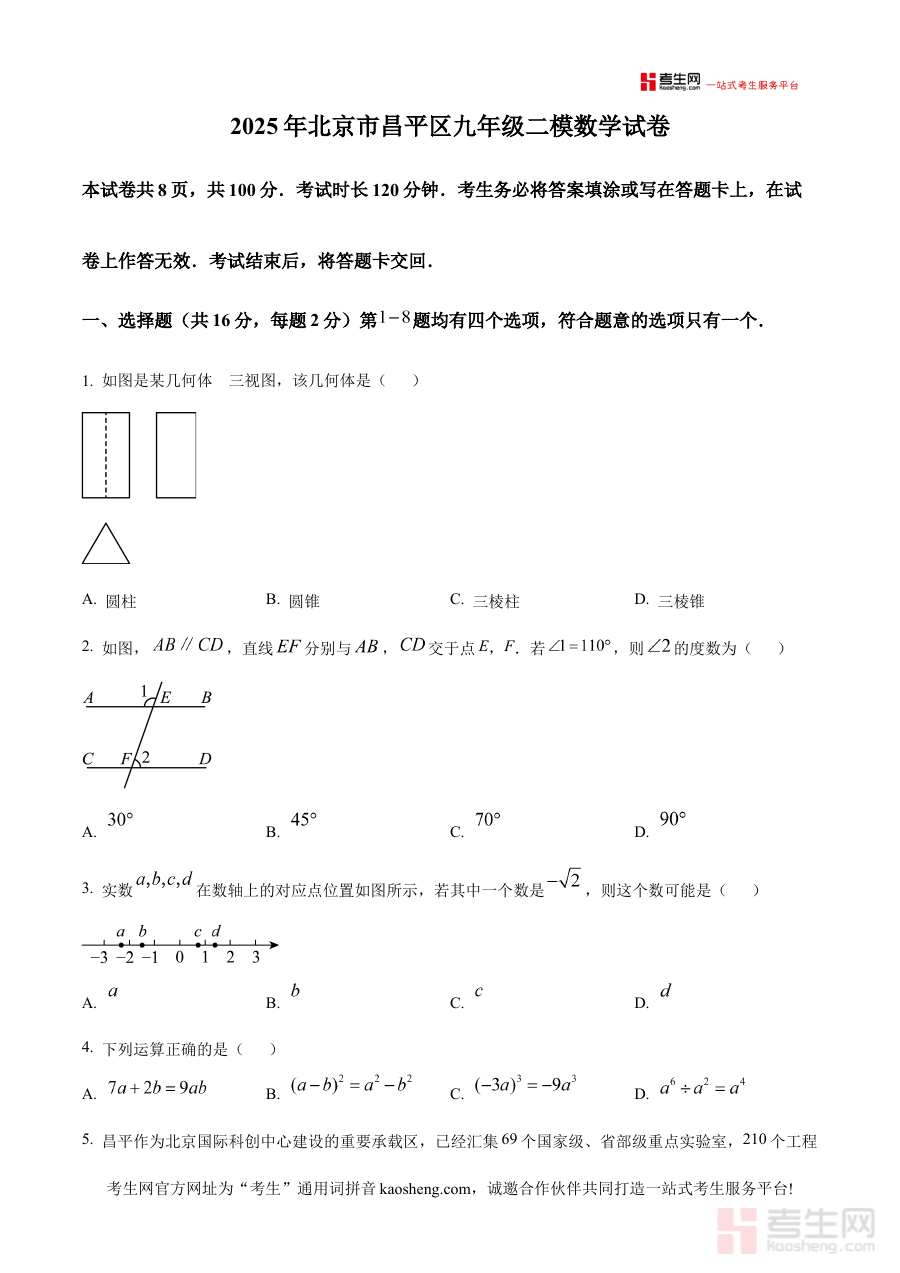《精品解析:2025年北京市昌平区九年级二模数学试卷 (原卷版)》是2025年北京市昌平区针对九年级学生组织的第二次模拟考试数学科目的原卷版本备考资料,能够帮助使用者熟悉该区域二模考试的命题框架与试卷布局,为后续的系统复习提供贴合本地考试实际的参考依据。