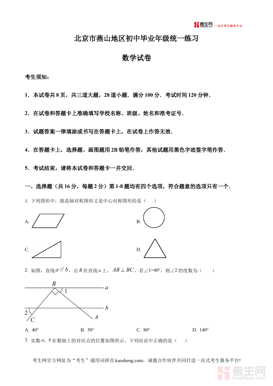 《精品解析:2025年北京市燕山区九年级中考一模数学试题(原卷版)》是2025年北京市燕山区针对九年级学生推出的中考一模数学原卷形式的备考资料,聚焦中考前关键阶段的阶段性检测需求。中考一模作为九年级学生衔接日常学习与中考实战的重要桥梁,该资料严格遵循燕山区本地的中考命题标准与教学实际,呈现了与区域一模考试完全一致的试卷结构和形式,为学生提供了贴合本地考情的备考素材。