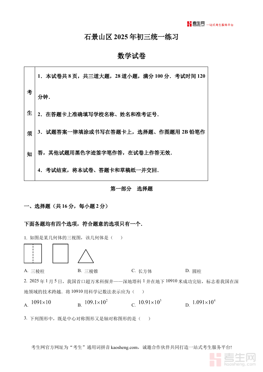 《精品解析:2025年北京市石景山区九年级统一练习(一模)数学试题 (原卷版)》是2025年北京市石景山区针对九年级学生开展的数学学科统一练习(一模)相关备考资料,精准对应该区域九年级数学阶段性考试的需求。作为本地重要的模拟考试资料,它能够帮助使用者提前熟悉石景山区一模考试的命题特点与考查方向,为后续的系统复习与备考准备提供可靠依据。
