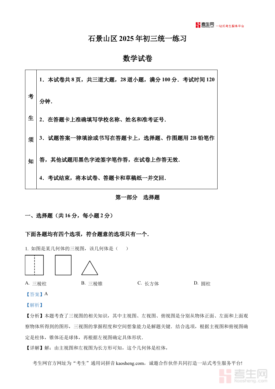 《精品解析:2025年北京市石景山区九年级统一练习(一模)数学试题 (解析版)》是针对2025年北京市石景山区九年级数学学科统一练习(一模)的专业备考资料。该资料依托当地教育部门组织的阶段性检测考试编制,精准反映石景山区九年级数学教学的阶段性要求与考试导向,为学生提供贴合本地学情的备考支持。