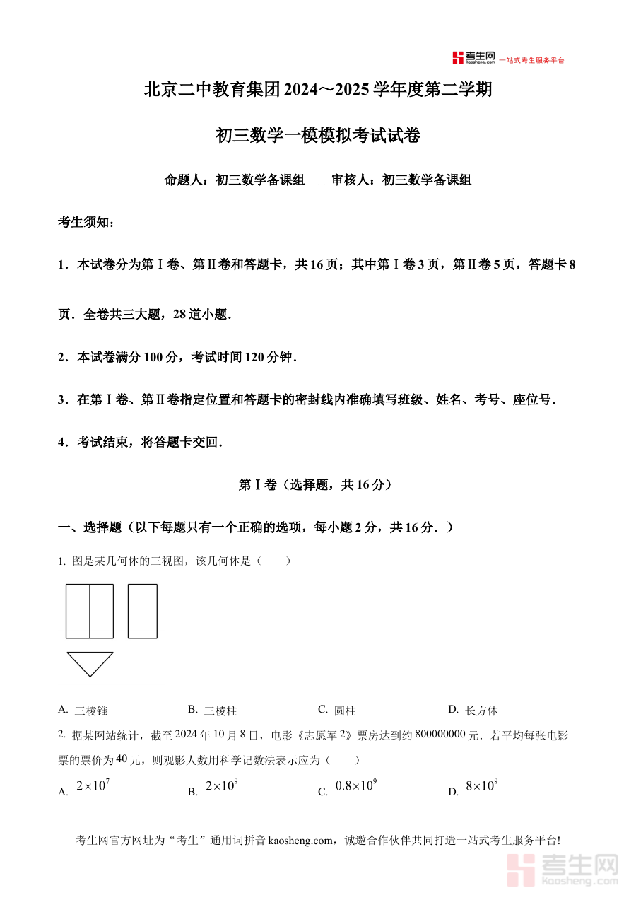 这份资料适用于北京市第二中学九年级全体数学学生,同时也可为北京地区其他学校的九年级学生提供重要参考。对于即将进入中考冲刺阶段的学生而言,使用该原卷版试卷进行模拟练习,不仅能增强对中考零模考试形式的适应能力,还能通过阶段性检测及时发现知识漏洞并进行补强,帮助学生在备考初期就建立清晰的复习目标和路径,为后续的强化训练和冲刺阶段打下坚实基础,助力学生在中考中取得理想成绩。