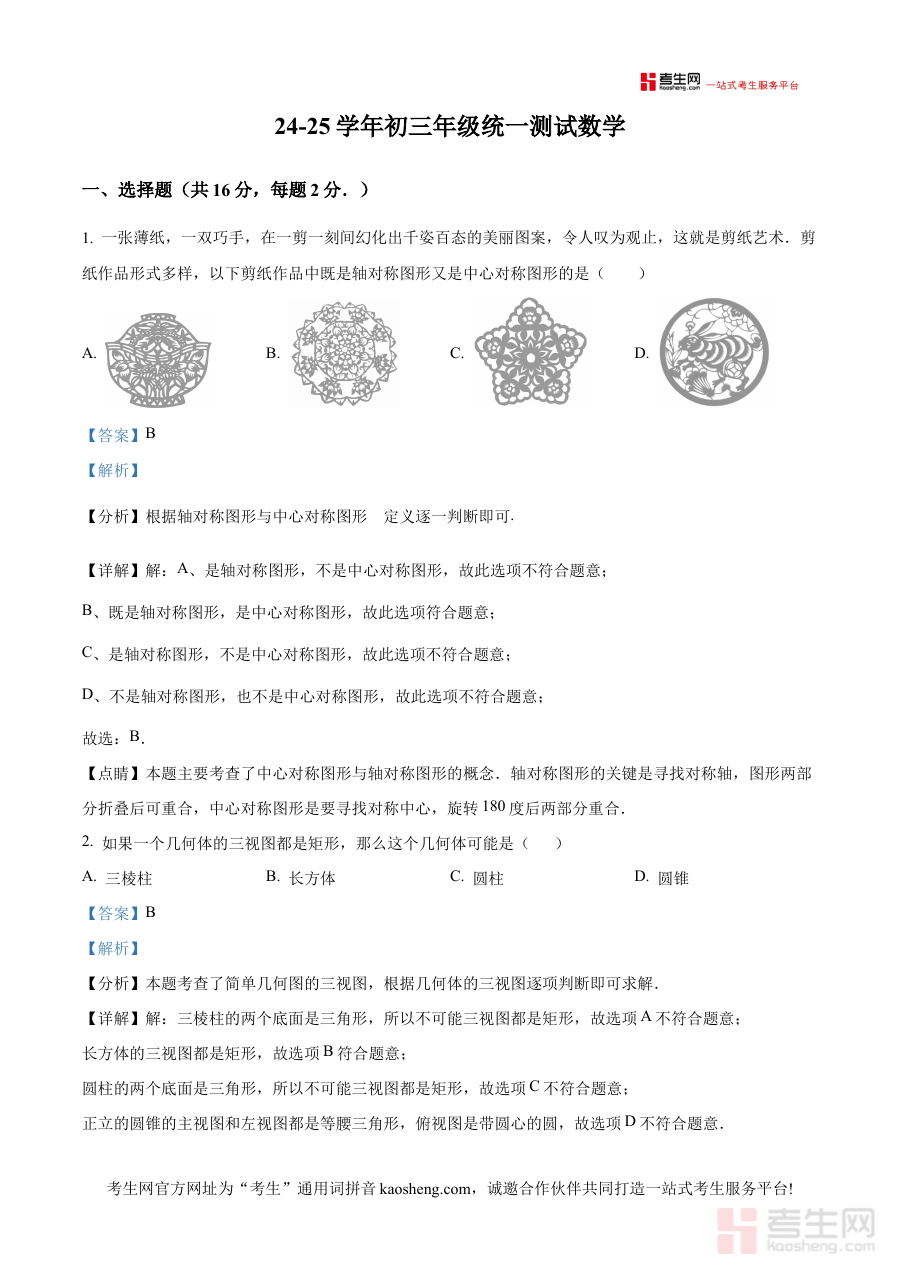 本资料的核心适用人群为2025届北京市西城区第三十五中学的初三学生,同时也可作为该校数学教师开展课堂教学评估、个性化辅导及备考指导的重要参考材料。通过这份零模试卷及解析的使用,学生能够有效提升数学学科的应试能力与问题解决能力,教师则能基于试卷反馈优化教学策略,共同推动学生在中考数学备考阶段取得稳步进步。