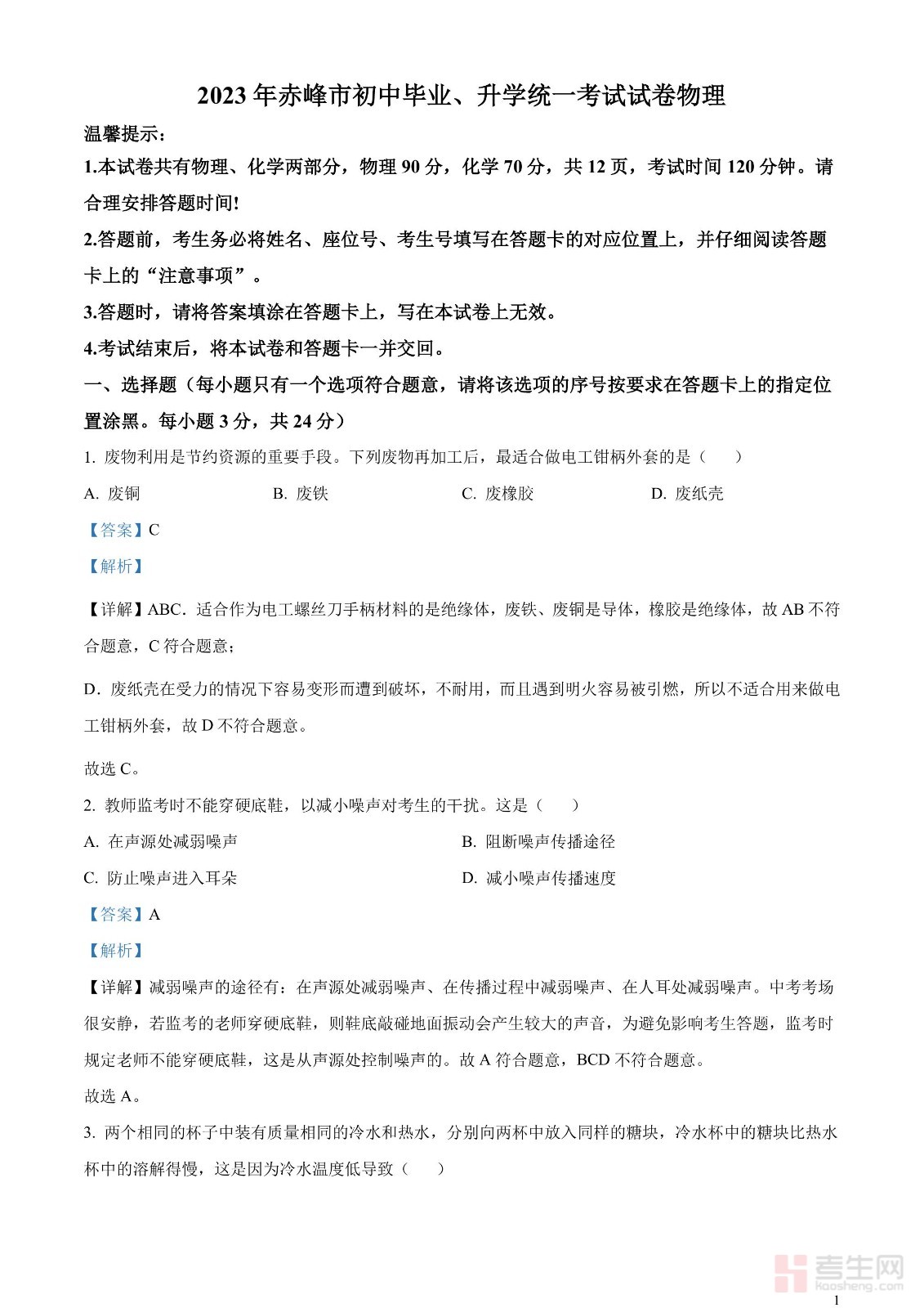 2023年内蒙古赤峰市中考理综物理试题(解析版)
