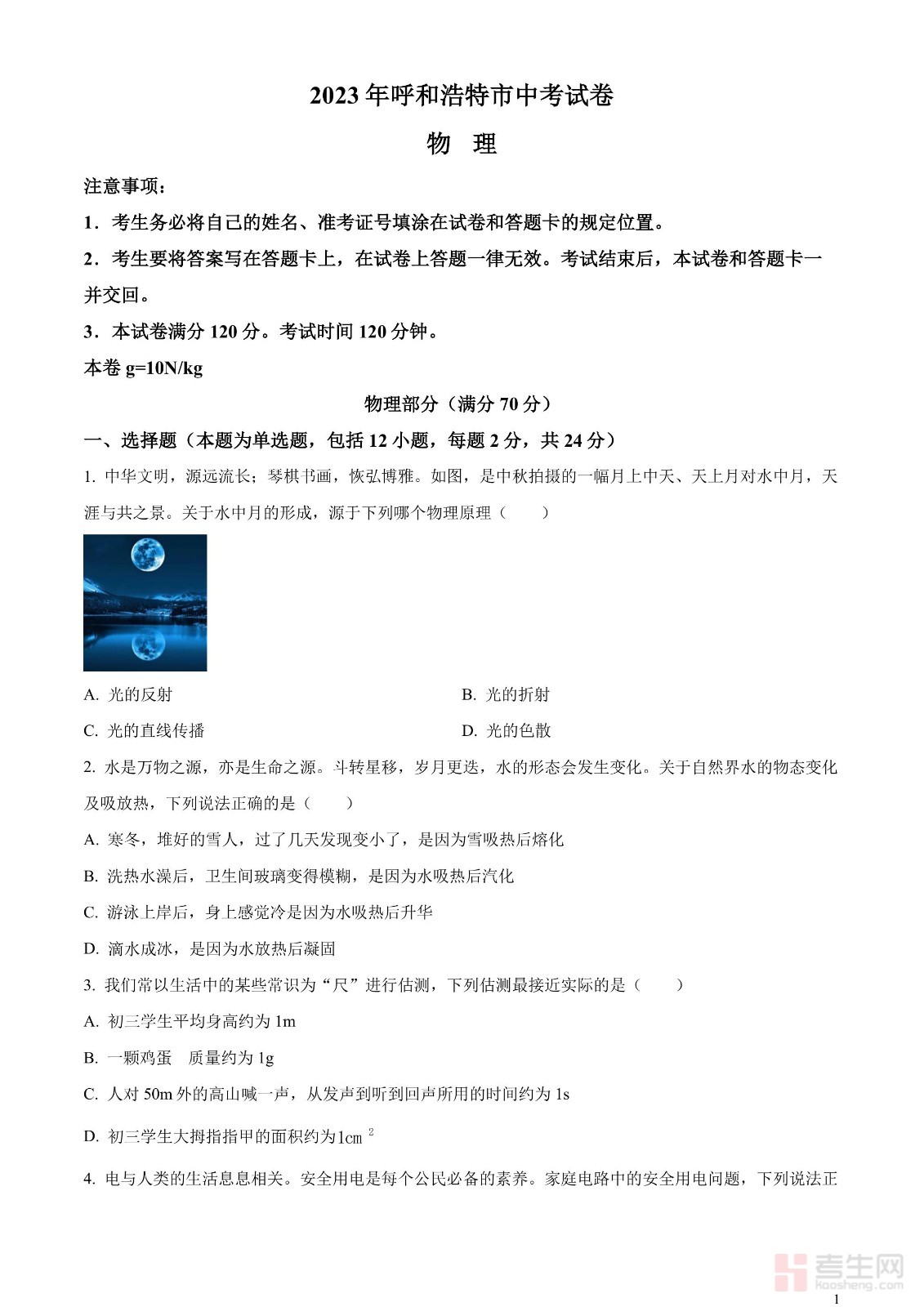 2023年内蒙古呼和浩特市中考物理试题(原卷版)