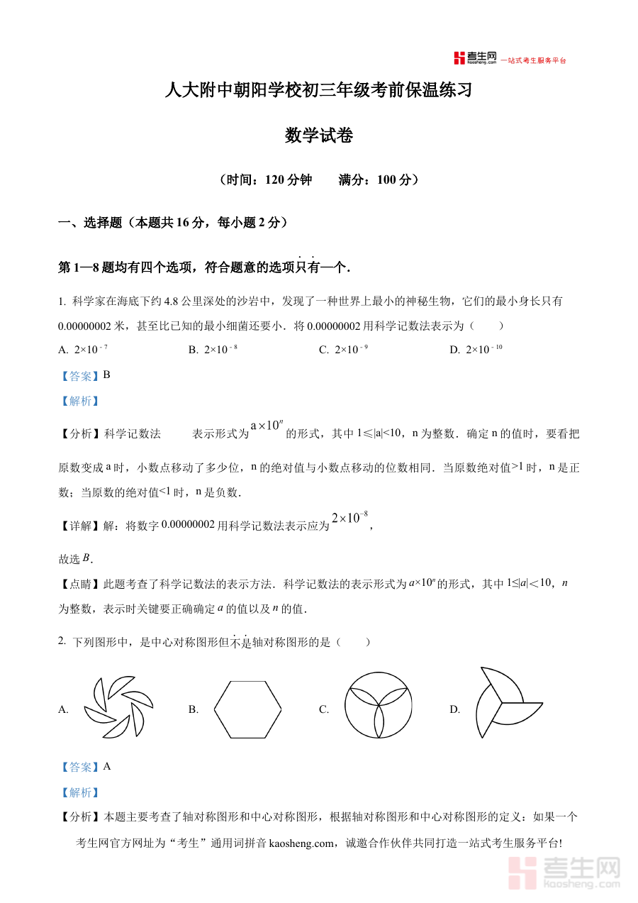 本资料适用于北京市朝阳区人朝分实验学校及同类学校的2024-2025学年下学期九年级学生、备考中考的数学学习者,其解析内容有助于深化考点理解与应用能力提升,为中考考前高效复习提供有力支撑,助力使用者在阶段检测中明确方向、优化备考规划。