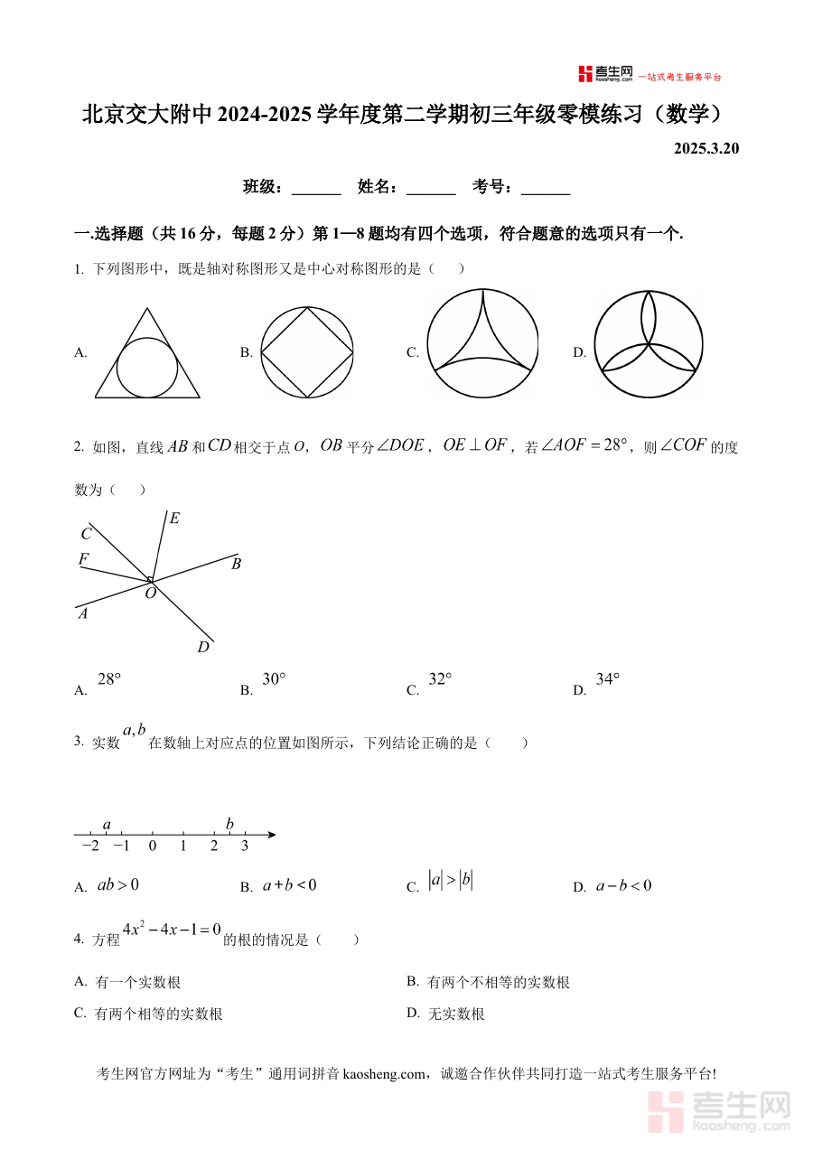《精品解析:北京市海淀区北京交通大学附属中学2025年九年级中考零模数学练习(原卷版)》是针对北京市海淀区2025年九年级学生中考备考设计的阶段性练习资料,聚焦中考零模这一关键备考节点,依托北京交通大学附属中学的教学资源与命题思路,为学生提供贴合区域考试方向的练习载体。
