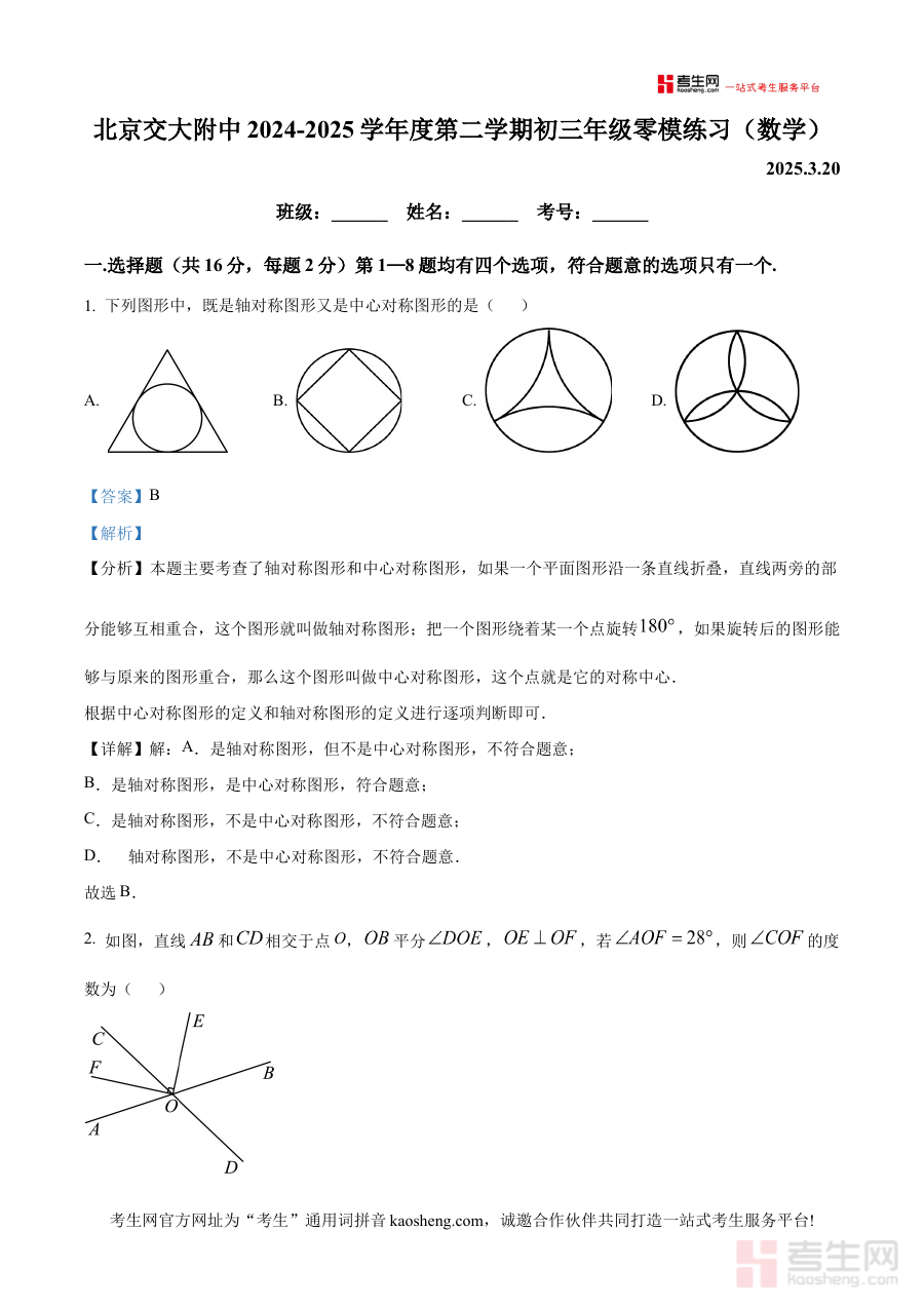 《精品解析:北京市海淀区北京交通大学附属中学2025年九年级中考零模数学练习(解析版)》是面向北京市海淀区2025届九年级学生的中考零模数学专项备考资料,由北京交通大学附属中学结合本地教学进度与中考命题方向精心编制而成,聚焦中考前零模阶段的复习核心需求,为学生提供贴合区域教学实际和中考考查趋势的高质量练习资源。
