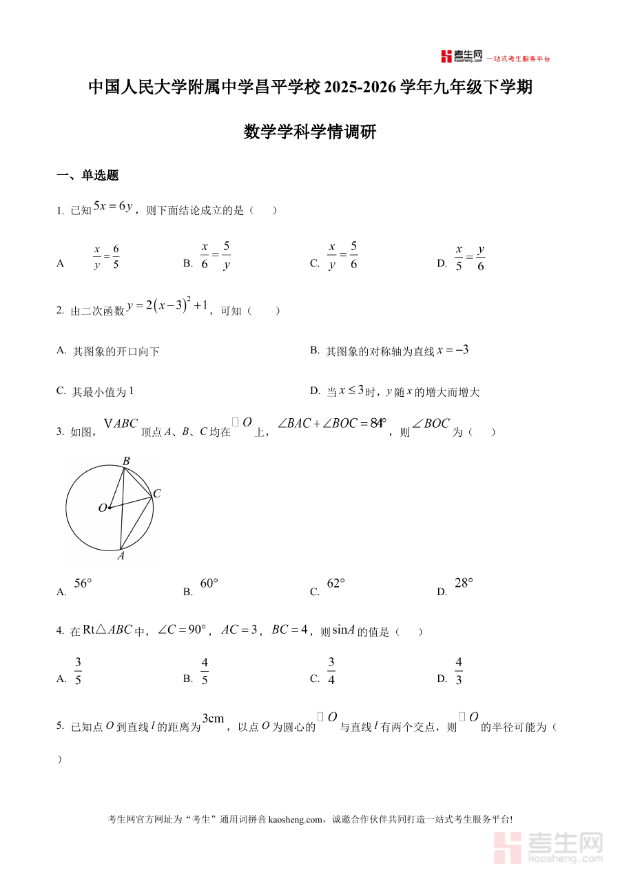 《精品解析:北京中国人民大学附属中学昌平学校2025-2026学年九年级下学期数学学科学情调研(原卷版)》是北京地区中国人民大学附属中学昌平学校在2025-2026学年面向九年级下学期学生推出的数学学科阶段性学情调研原卷资料,属于该阶段数学学习与中考备考的重要参考材料。该资料紧密结合学校教学进度与学情评估需求,为师生提供了贴合学年阶段的检测载体,有助于有效衔接后续的中考备考环节,是学校阶段性教学评估体系中的关键组成部分。