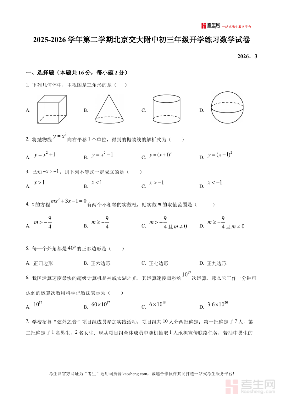 《精品解析:北京交通大学附属中学2025-2026学年九年级下学期开学练习数学试卷(原卷版)》是北京交通大学附属中学针对2025-2026学年九年级下学期学生设计的开学阶段数学练习资料。该资料立足北京地区数学教学要求及学校自身教学进度,聚焦九年级下学期开学初期的学习衔接需求,为学生提供贴合校情的练习载体,帮助学生在新学期伊始快速适应数学学习节奏,明确学习方向与重点。