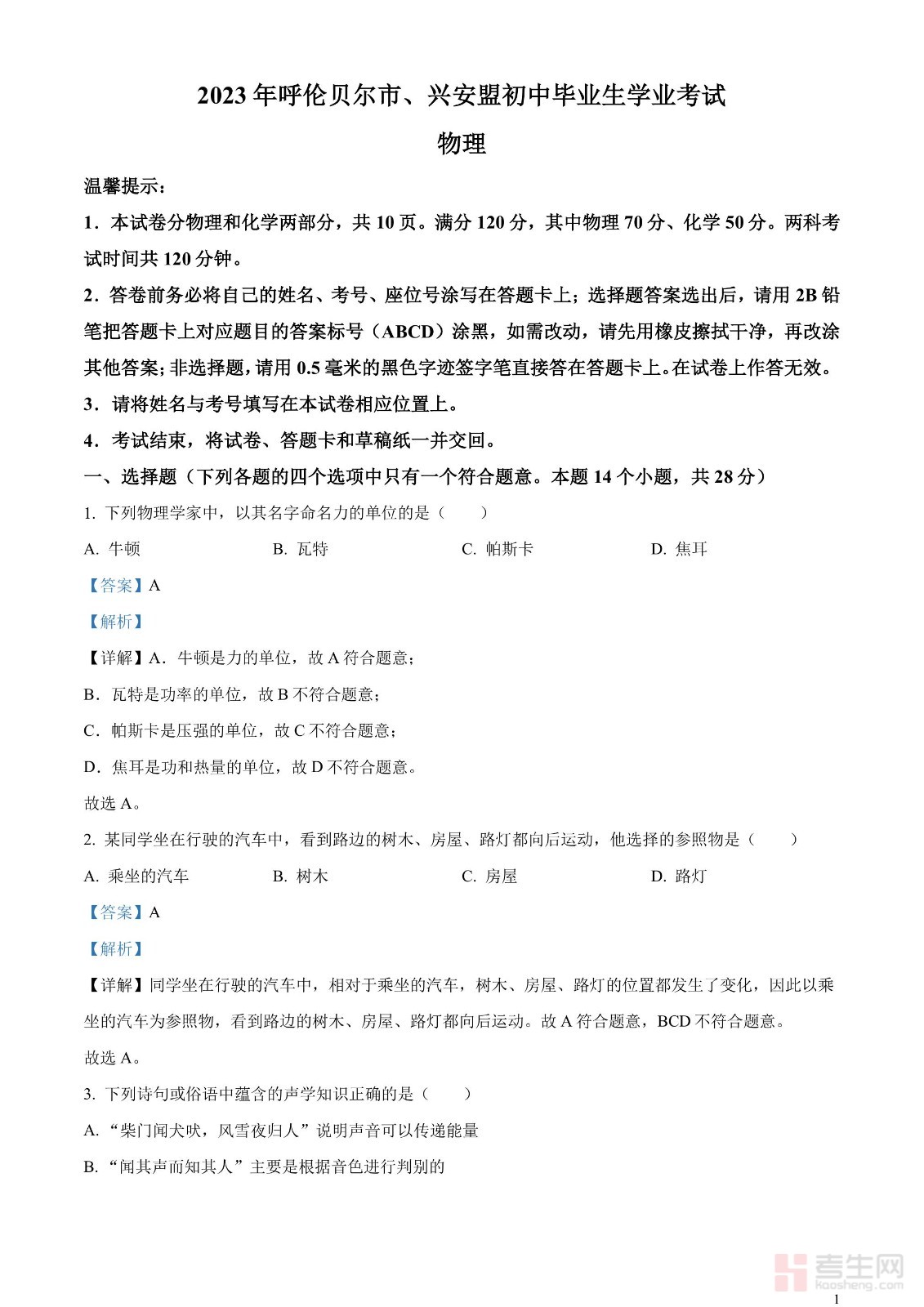 2023年内蒙古自治区兴安盟、呼伦贝尔中考物理试题(解析版)