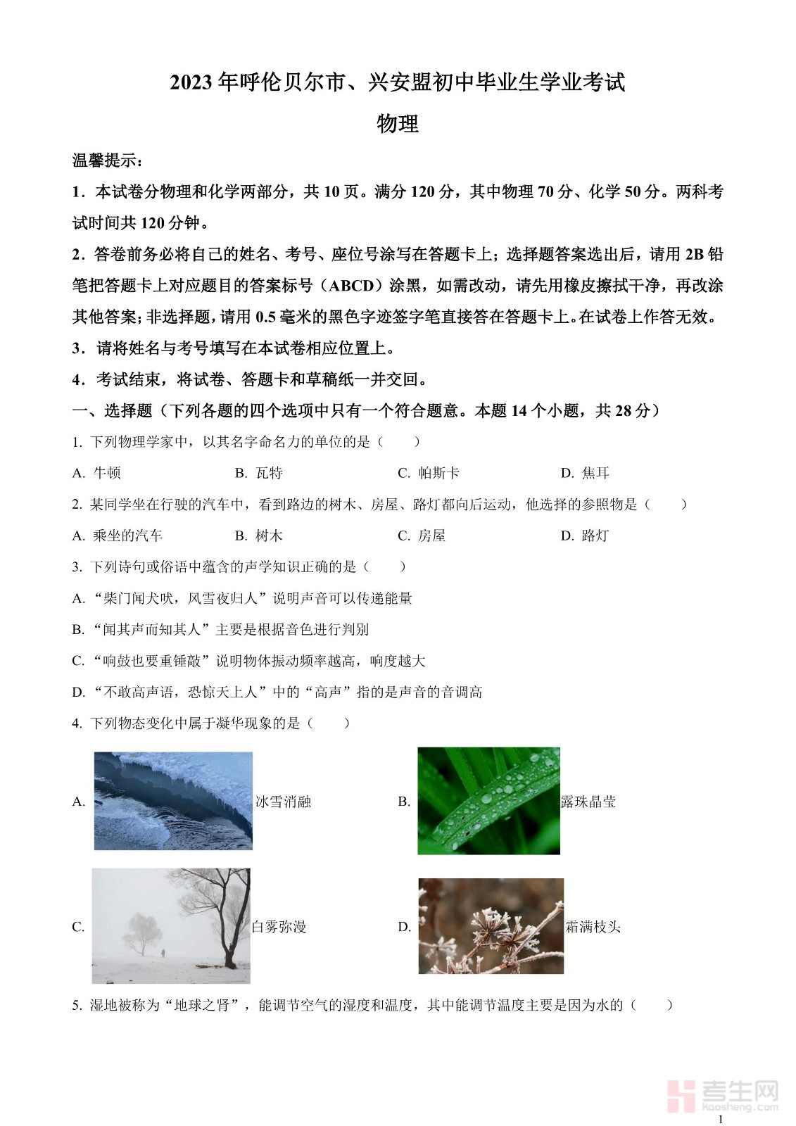 2023年内蒙古自治区兴安盟、呼伦贝尔中考物理试题(原卷版)
