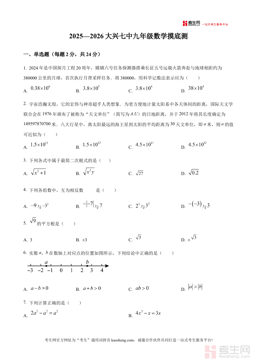 此资料适用于北京市大兴区第七中学2026届九年级学生,作为春季开学收心阶段的自我检测工具,其原卷形式能模拟校内自测场景,助力学生提前适应检测流程,通过自测发现知识薄弱点,为后续九年级数学学习及备考规划筑牢基础,具有显著的阶段指导价值。
