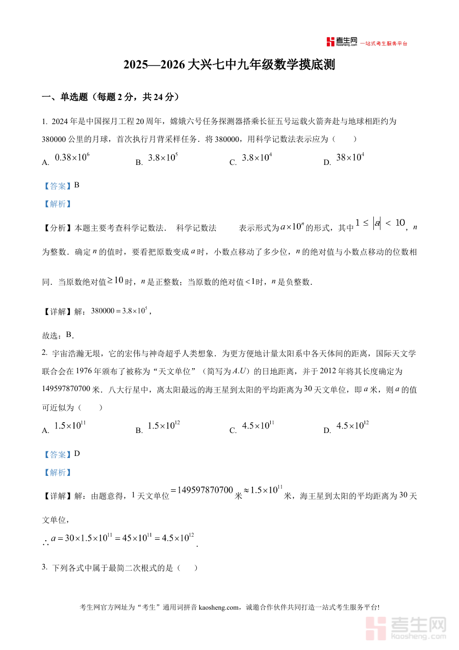 《精品解析:北京市大兴区第七中学2026年九年级数学春季开学收心自测(解析版)》是针对北京市大兴区第七中学2026年九年级学生设计的数学学科春季开学收心自测配套解析资料,结合该年级春季学期开学阶段的学习特点与检测需求,为相关教学及自主复习活动提供专业支持。