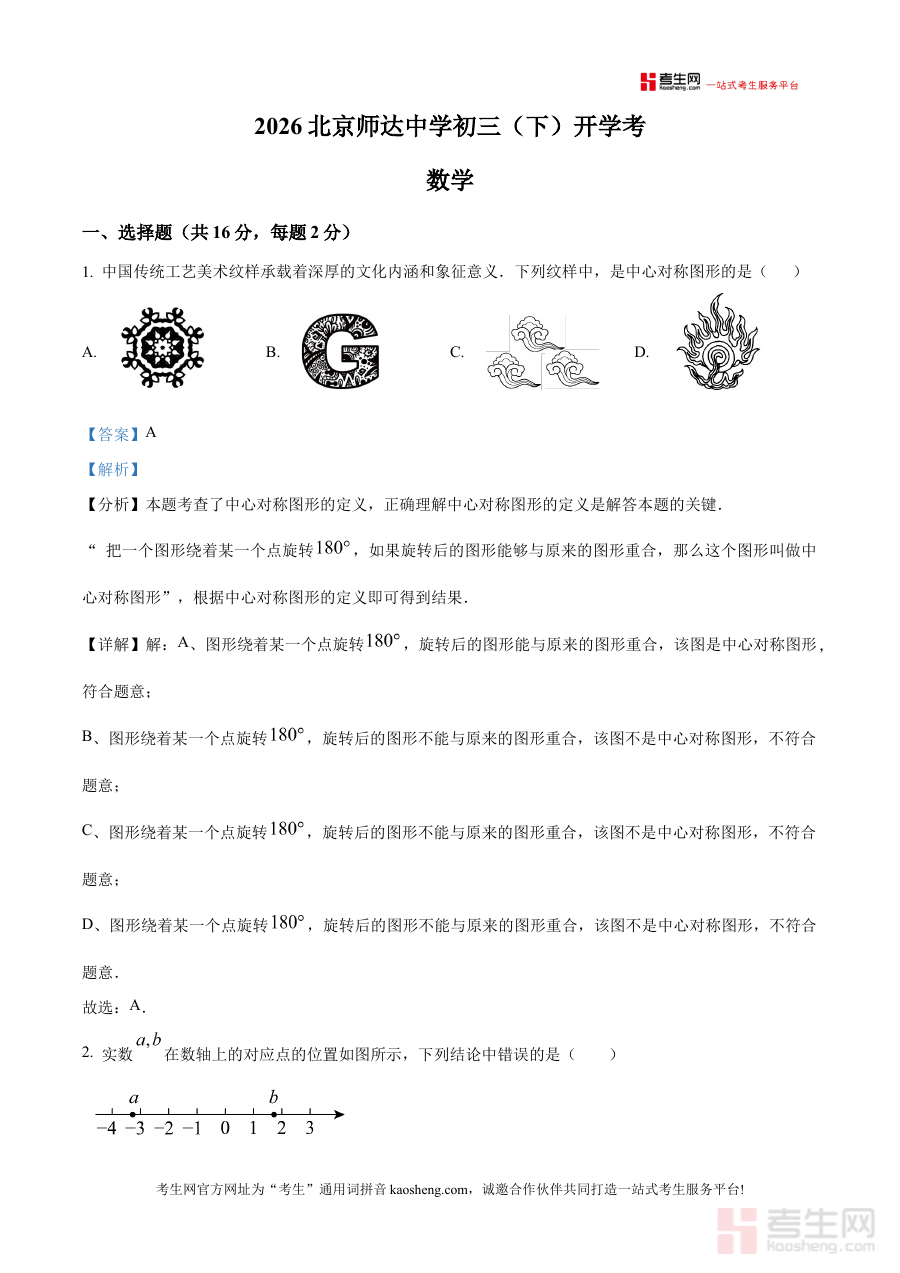 《精品解析:北京市师达中学2025--2026学年下学期九年级阶段学情自测数学试卷(解析版)》是面向北京市师达中学2025-2026学年下学期九年级学生的数学学科阶段性检测试卷解析资料,精准对应该学年下学期九年级数学的阶段学情自测需求,为相关学习与备考提供专业参考。