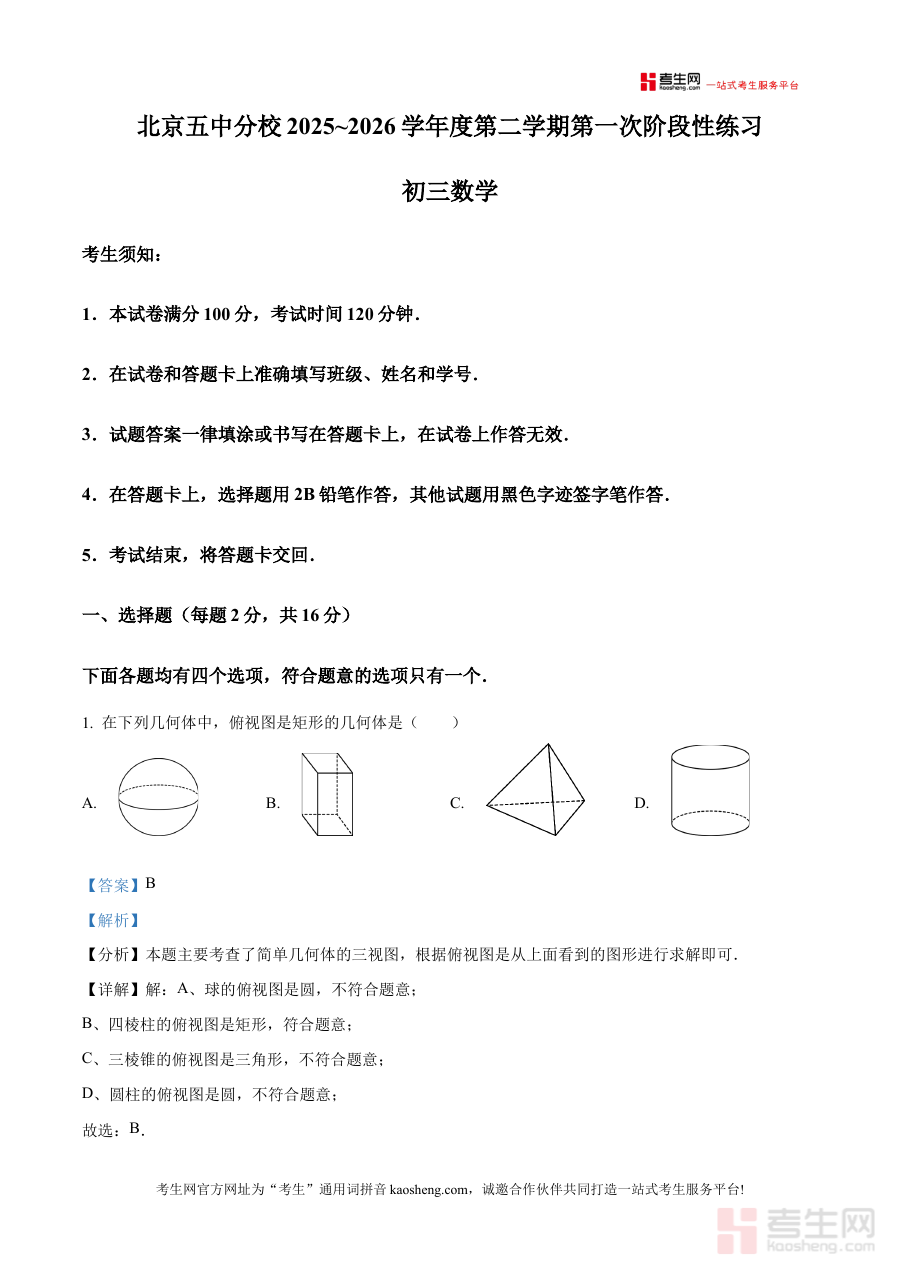 《精品解析:北京市第五中学分校 2025-2026学年度第二学期第一次阶段性练习 : 九年级数学(解析版)》是北京市第五中学分校针对2025-2026学年度第二学期九年级数学学科推出的阶段性练习解析资料。该资料对应学期内首次阶段性检测环节,聚焦九年级数学学科的阶段学习内容,为相关群体提供了具有针对性的备考支持,是该阶段数学学习过程中的重要辅助材料,能够有效衔接日常教学与阶段性评估需求。