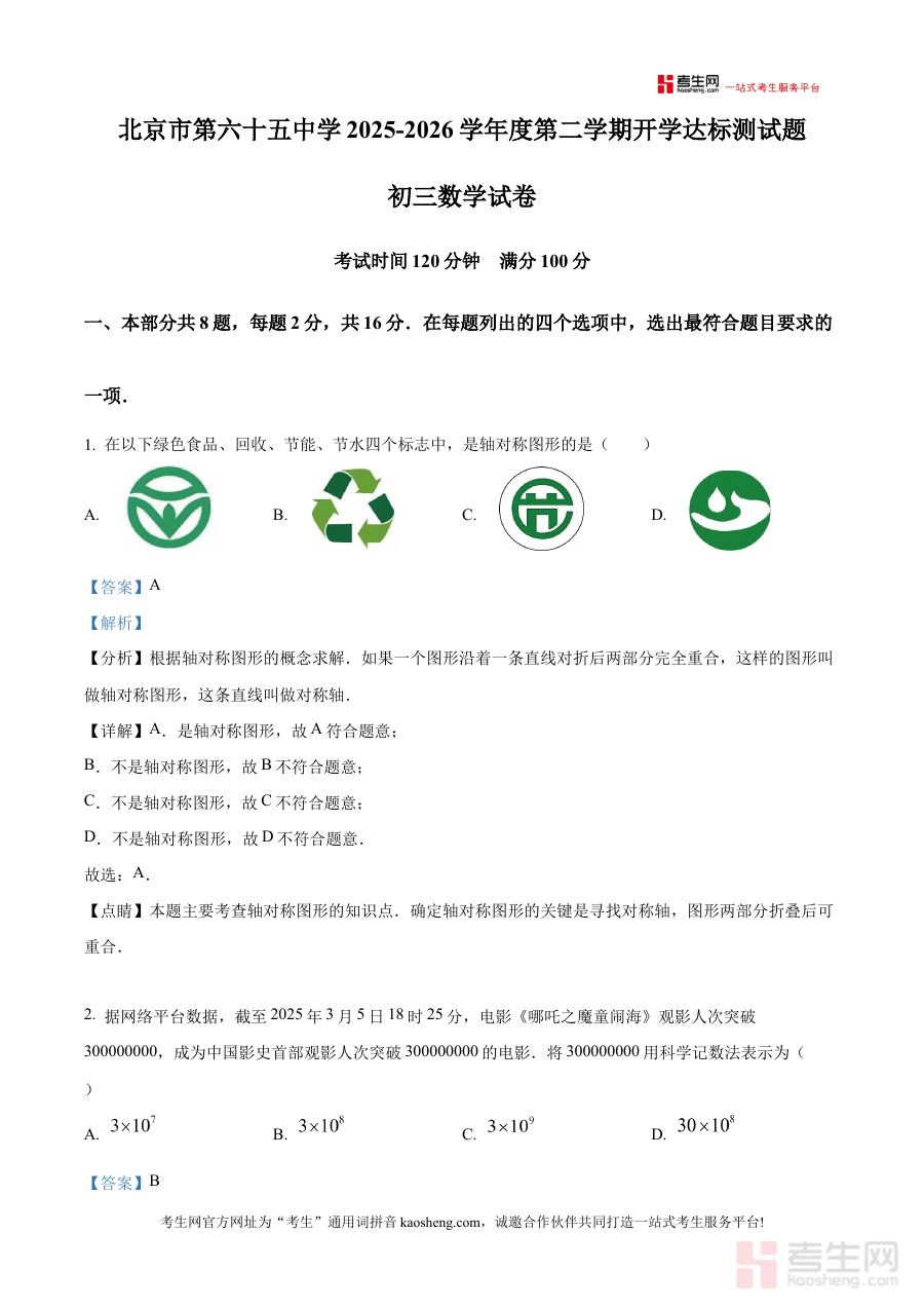 本资料的核心适用人群为北京第六十五中学初三在读学生,通过参与此次学情自测并深入理解解析内容,学生可有效完成新学期学习状态的调整与知识体系的梳理,为后续数学学科的系统复习及中考备考做好前期准备;此外,家长也可借助该资料了解孩子的学习动态,更好地配合学校与孩子做好学习规划与支持工作。