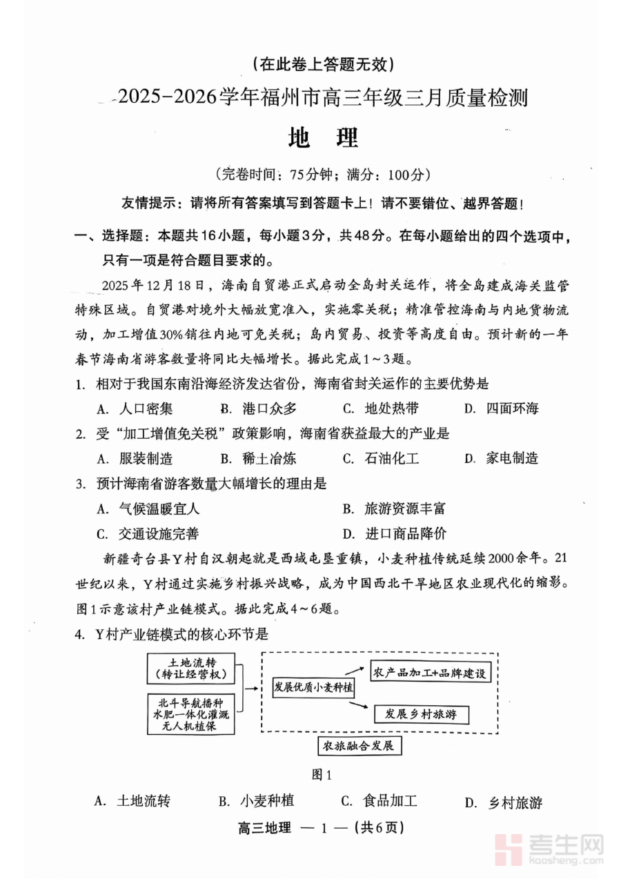 《地理试题:2025-2026学年福州市高三年级三月质量检测》是针对2025至2026学年福州市高三年级学生设计的地理学科阶段性质量检测资料,属于区域性高三下学期重要检测类备考资源,能够精准贴合本地高三地理教学的进度安排与考试要求,为考生提供符合阶段学习目标的练习载体,帮助考生提前熟悉该阶段检测的命题思路与考查方向。