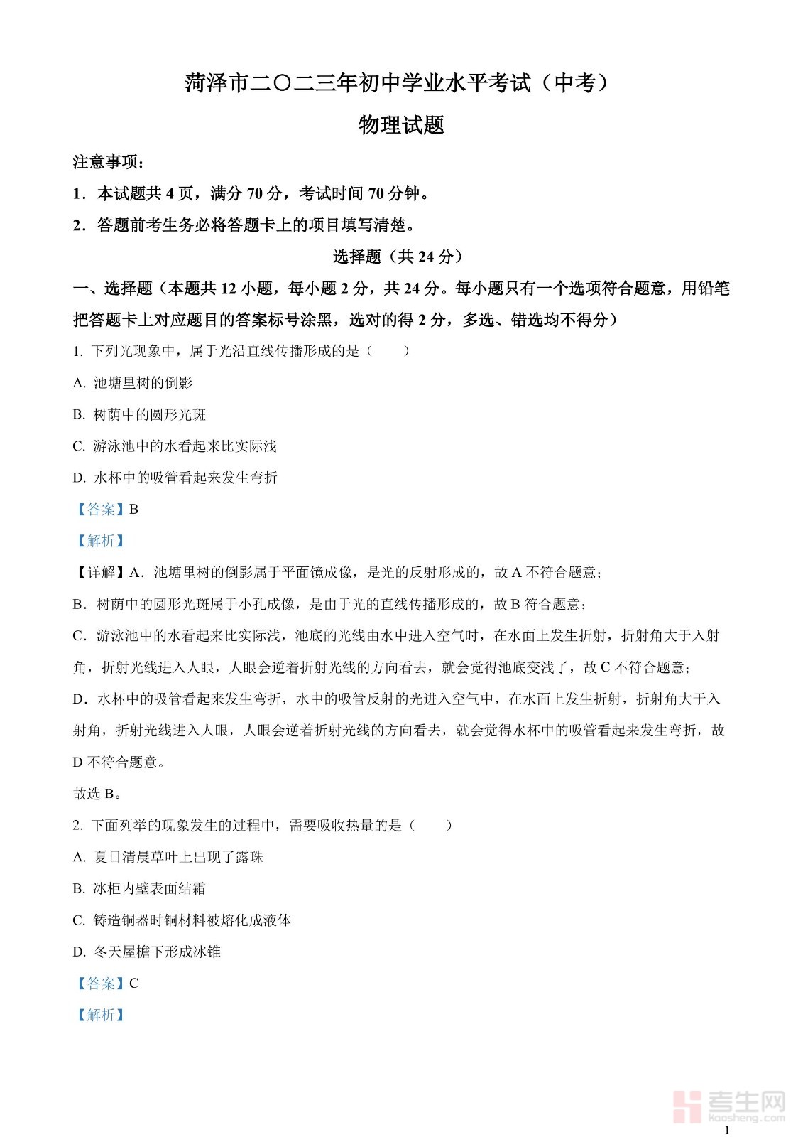 2023年山东省菏泽市中考物理试题(解析版)
