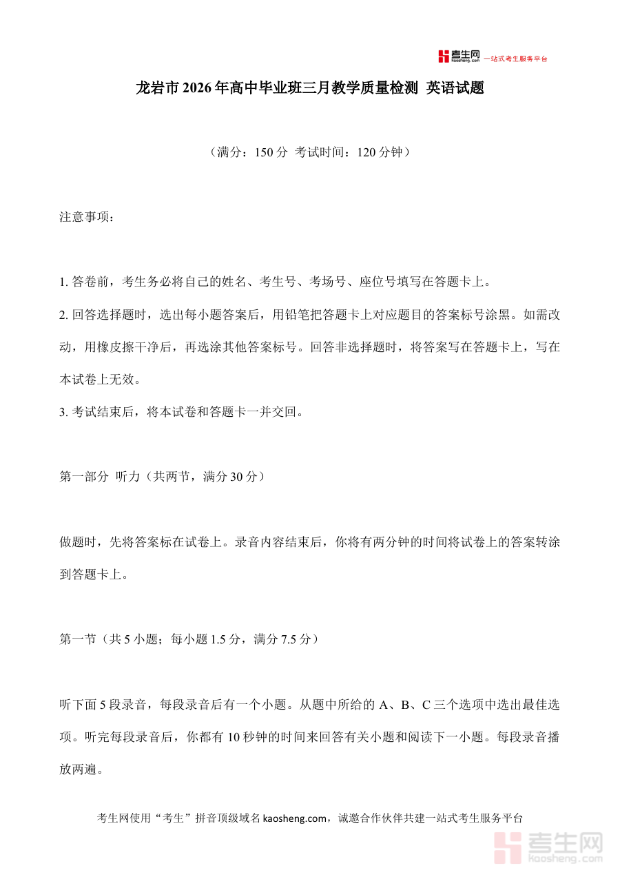 《福建省龙岩市2026年高中毕业班三月教学质量检测 英语试题》是福建省龙岩市针对2026届高中毕业生开展的三月阶段性教学质量检测的英语学科试题资料,属于区域内高三备考过程中的重要评估载体,其设计遵循当地高中英语教学的核心目标与高考备考的整体方向,能够客观反映该阶段学生在英语学科上的知识积累与能力发展状况。