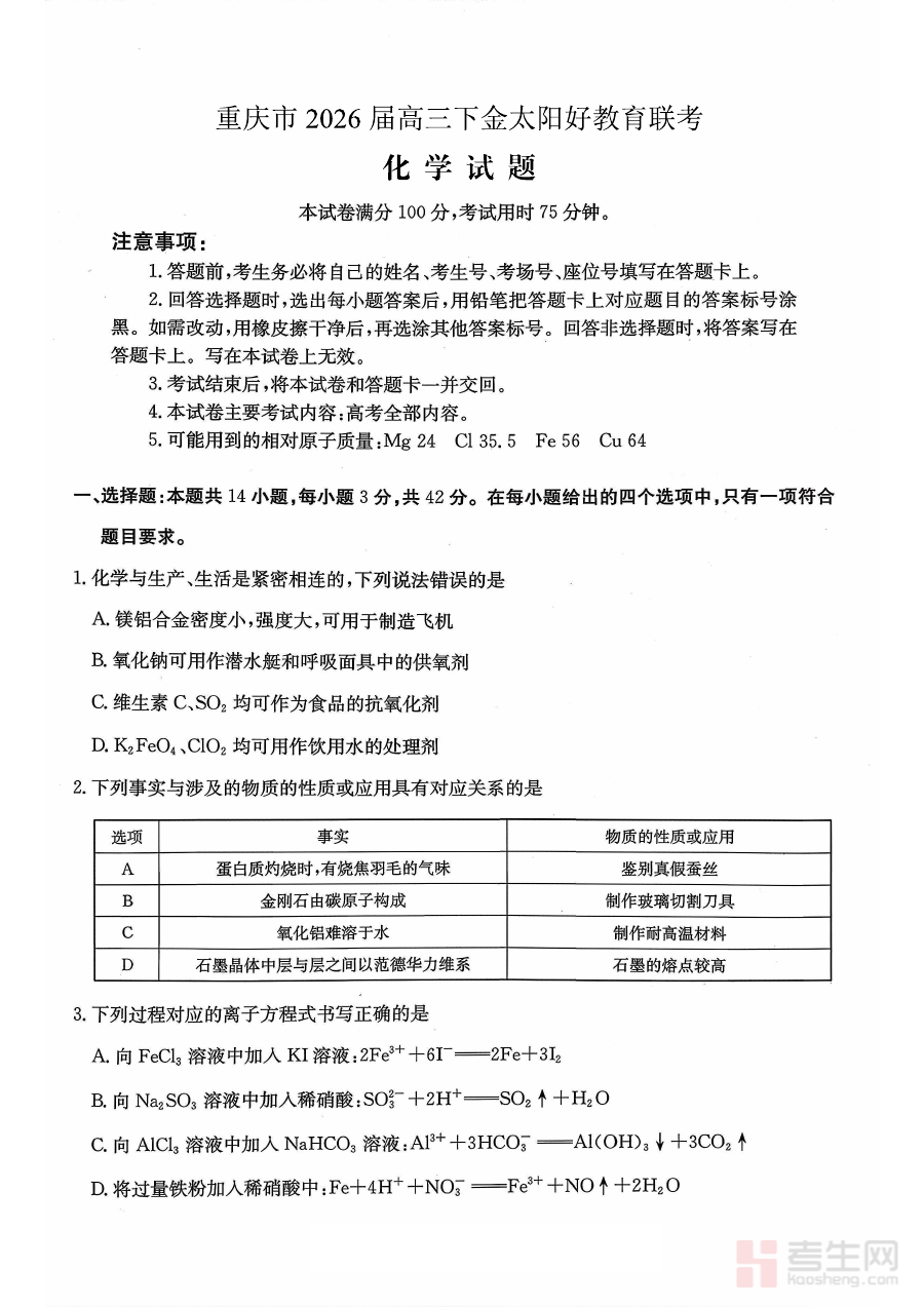 《重庆好教育联盟2026届高三下学期3月开学联考(26-284C)化学》是针对重庆市好教育联盟组织的2026届高三学生在第二学期3月开学阶段开展的联合考试所对应的化学学科备考资料,该考试属于高三下学期初期的重要阶段性测试,能够集中反映联盟内各学校高三学生在开学后的化学学科知识掌握程度与学习状态。
