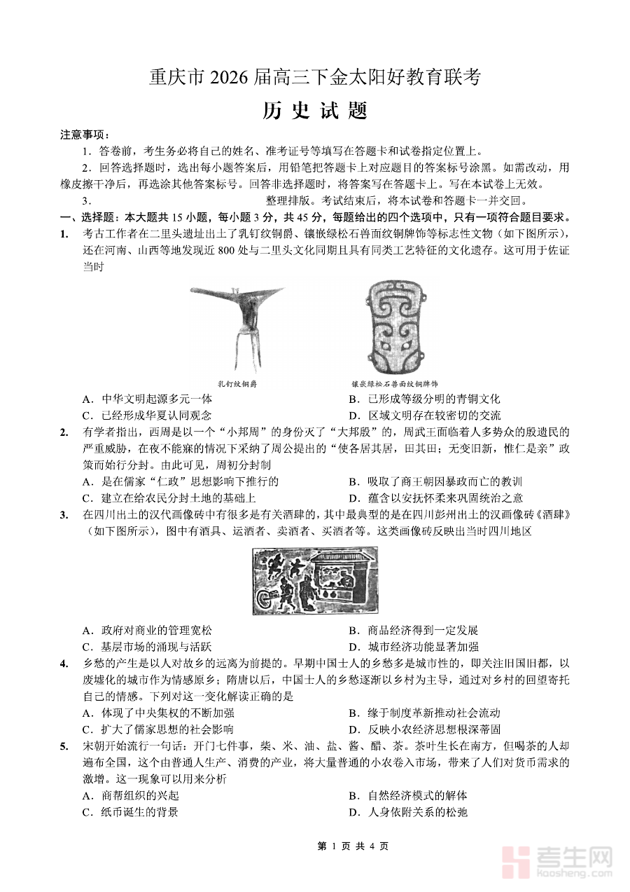 适用于重庆好教育联盟成员校及其他同类高中的2026届高三历史教师与学生,作为开学阶段的重要检测资料,其价值在于帮助学生明确自身历史学习的优势与不足,助力教师优化教学方案与备考策略,共同提升高考历史备考的针对性与有效性。